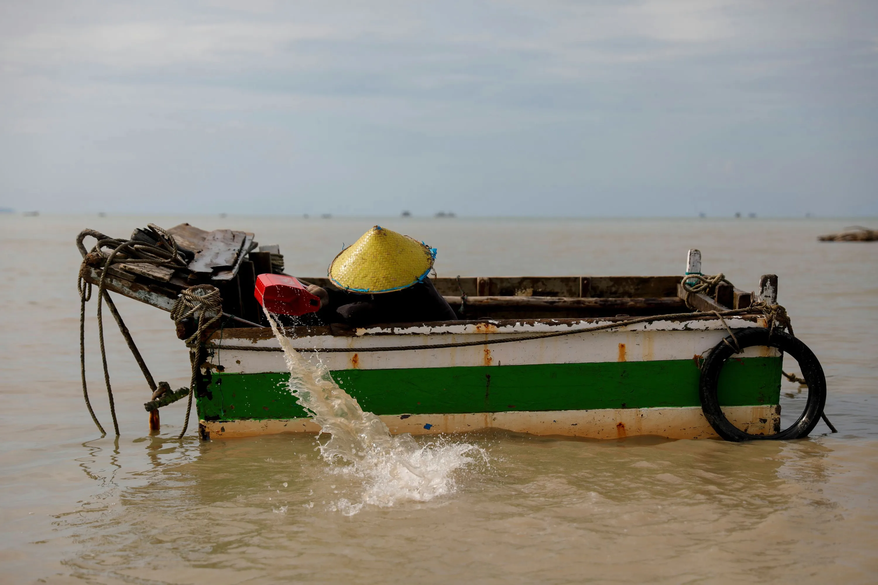 A fisherman pours water out of a boat on Sampur Beach, in Pangkal Pinang, on the island of Bangka, Indonesia, April 30, 2021. (Photo by Willy Kurniawan/Reuters)