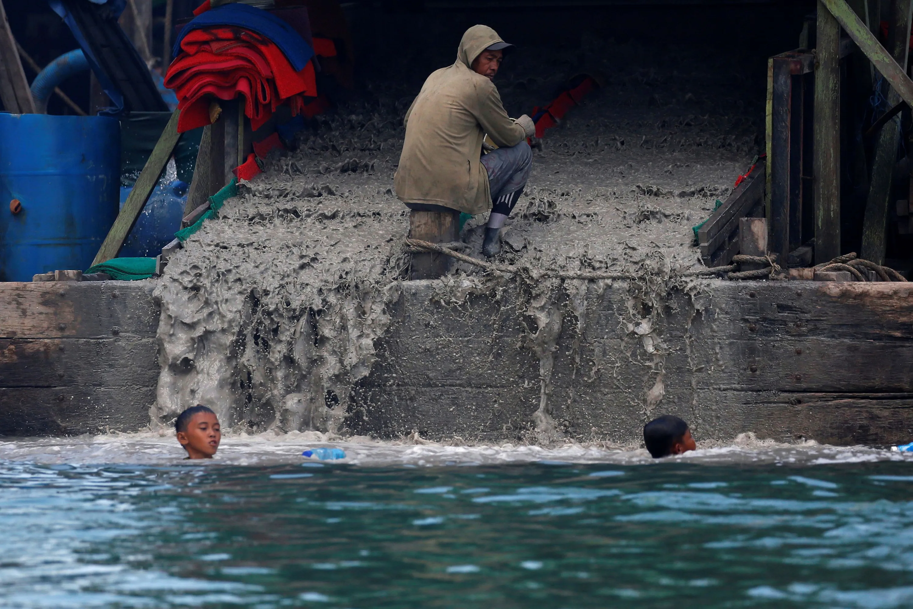 An artisanal tin miner rests as children swim near a pontoon off the coast of Toboali, on the southern shores of the island of Bangka, Indonesia, April 29, 2021. (Photo by Willy Kurniawan/Reuters)