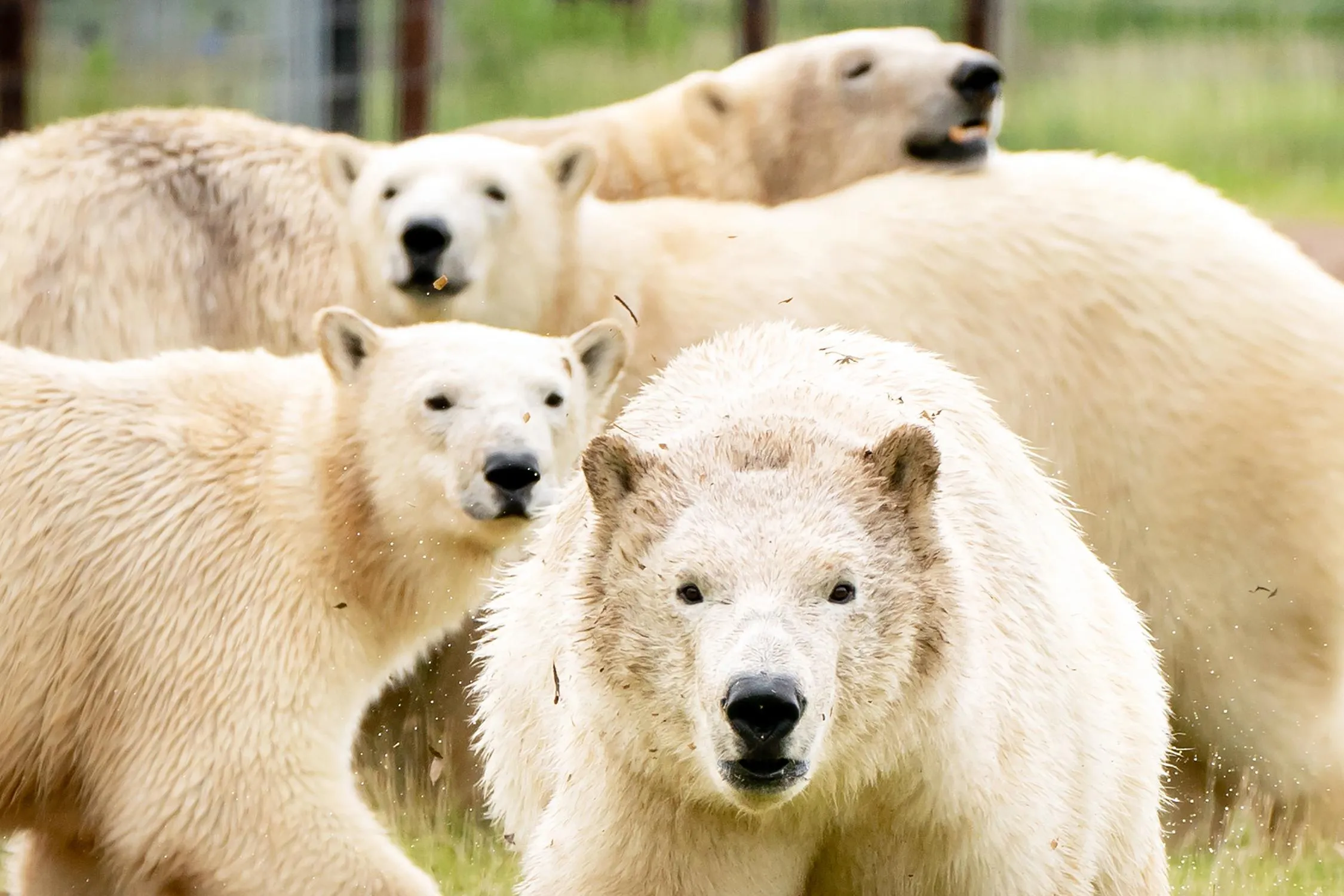 Flocke and her three cubs Indiana, Yuma and Tala get acquainted with their new surroundings at Yorkshire Wildlife Park in Cantley, near Doncaster on June 13, 2021. The polar bears were moved there from France as part of the European Endangered Species Programme. (Photo by Danny Lawson/PA Wire Press Association)