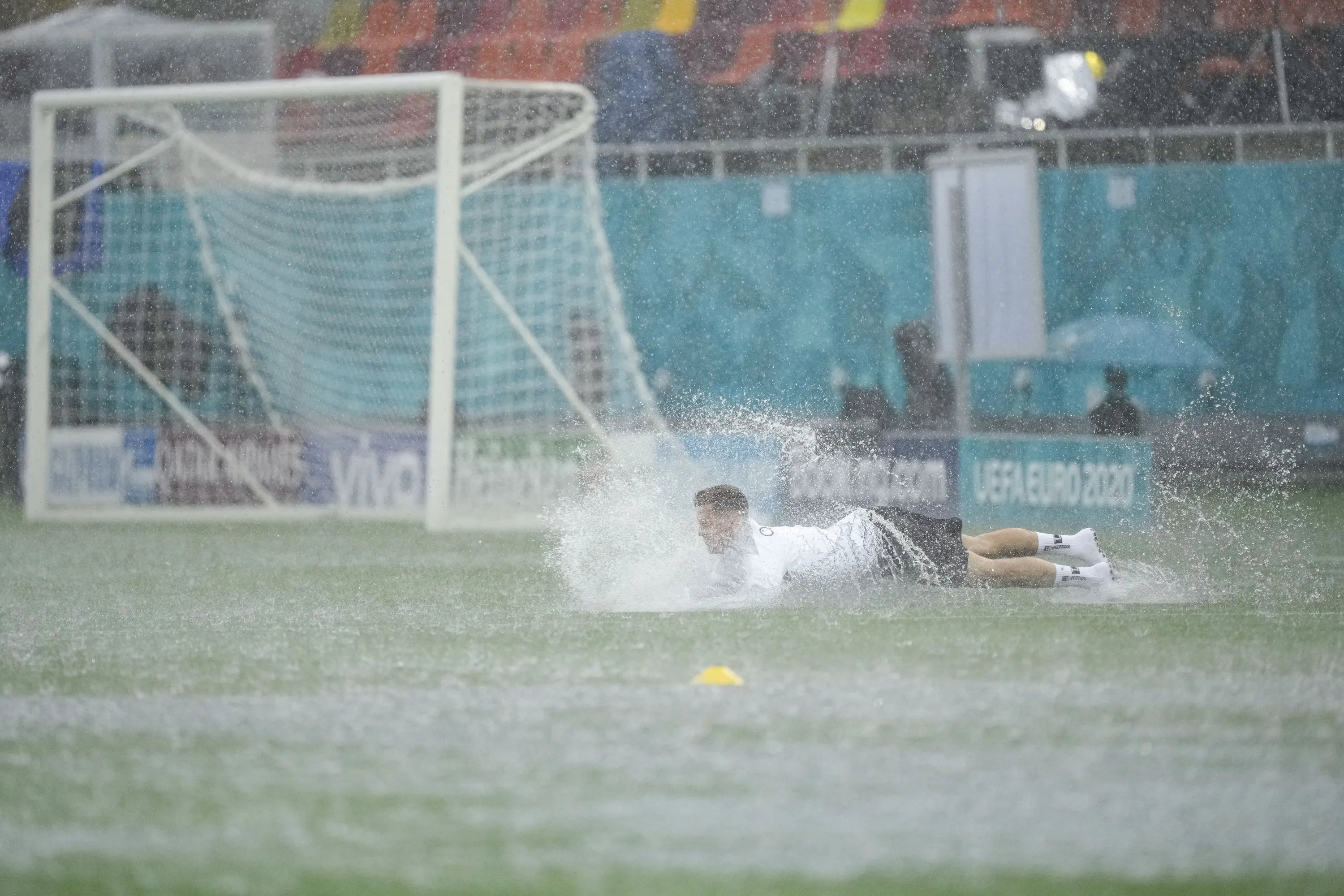 Austria's Christoph Baumgartner takes a dive on the pitch during a heavy rainfall before a training session at the National Arena stadium in Bucharest, Romania, Saturday, June 12, 2021, the day before the team's first match against North Macedonia. (Photo by Vadim Ghirda/AP Photo)