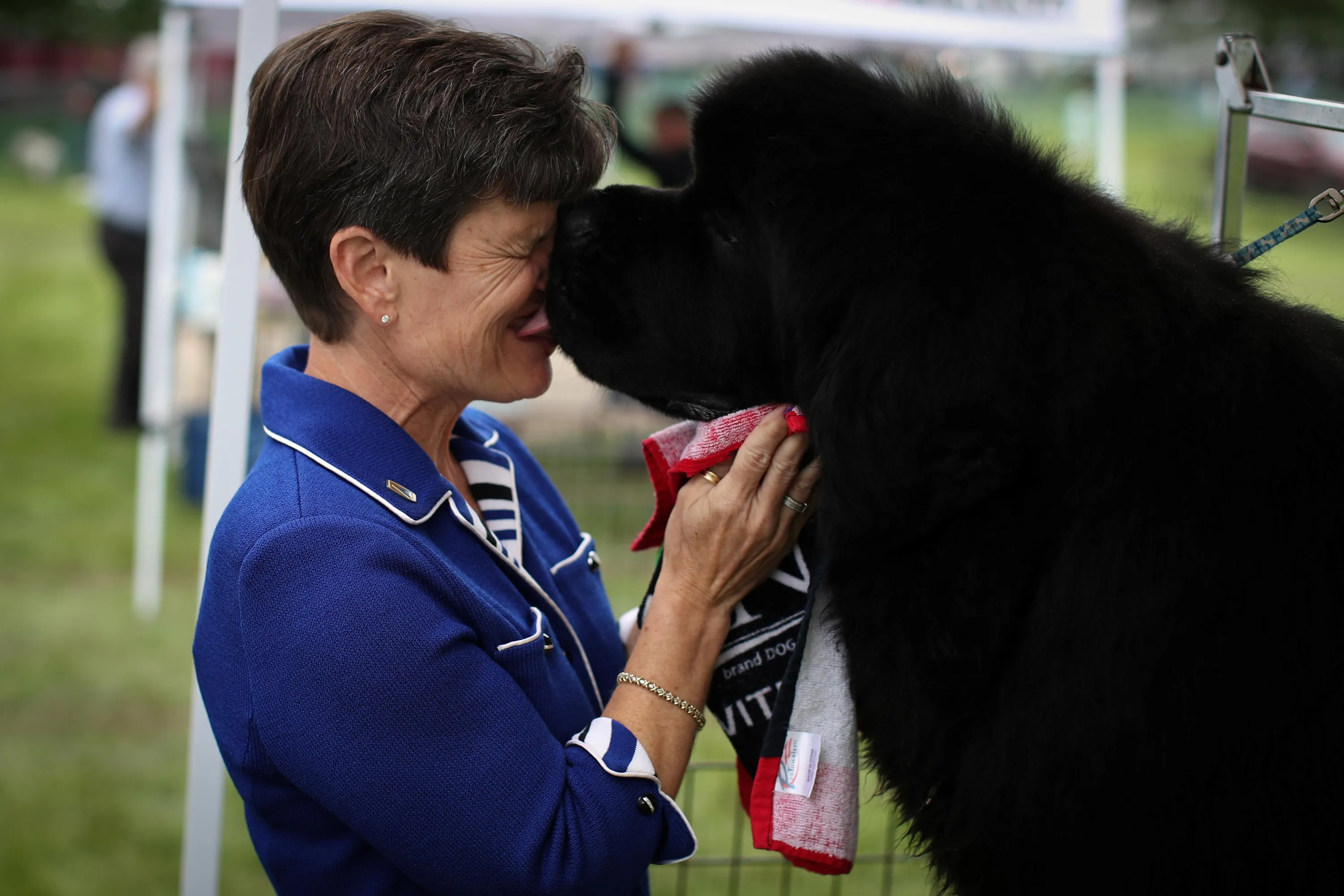 Matthew, a Newfoundland dog, licks his handler Karen Mammano in the benching area before judging at the 145th Westminster Kennel Club Dog Show at Lyndhurst Mansion in Tarrytown, New York, U.S., June 12, 2021. (Photo by Mike Segar/Reuters)