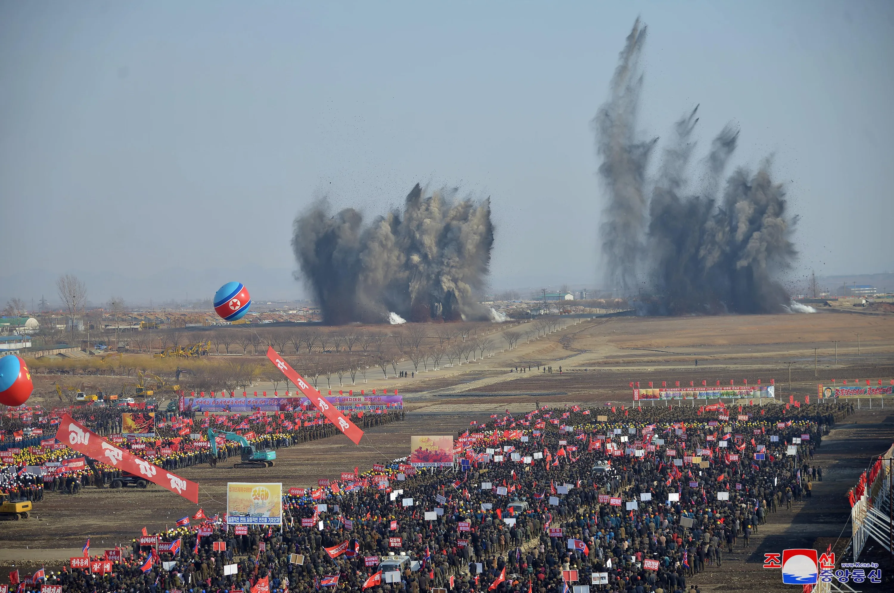 In this picture taken on March 23, 2021 and released from North Korea's official Korean Central News Agency (KCNA) on March 24, 2021 people attend ground-breaking ceremony of a construction project for building 10000 apartments in Pyongyang. (Photo by KCNA via KNS/AFP Photo)