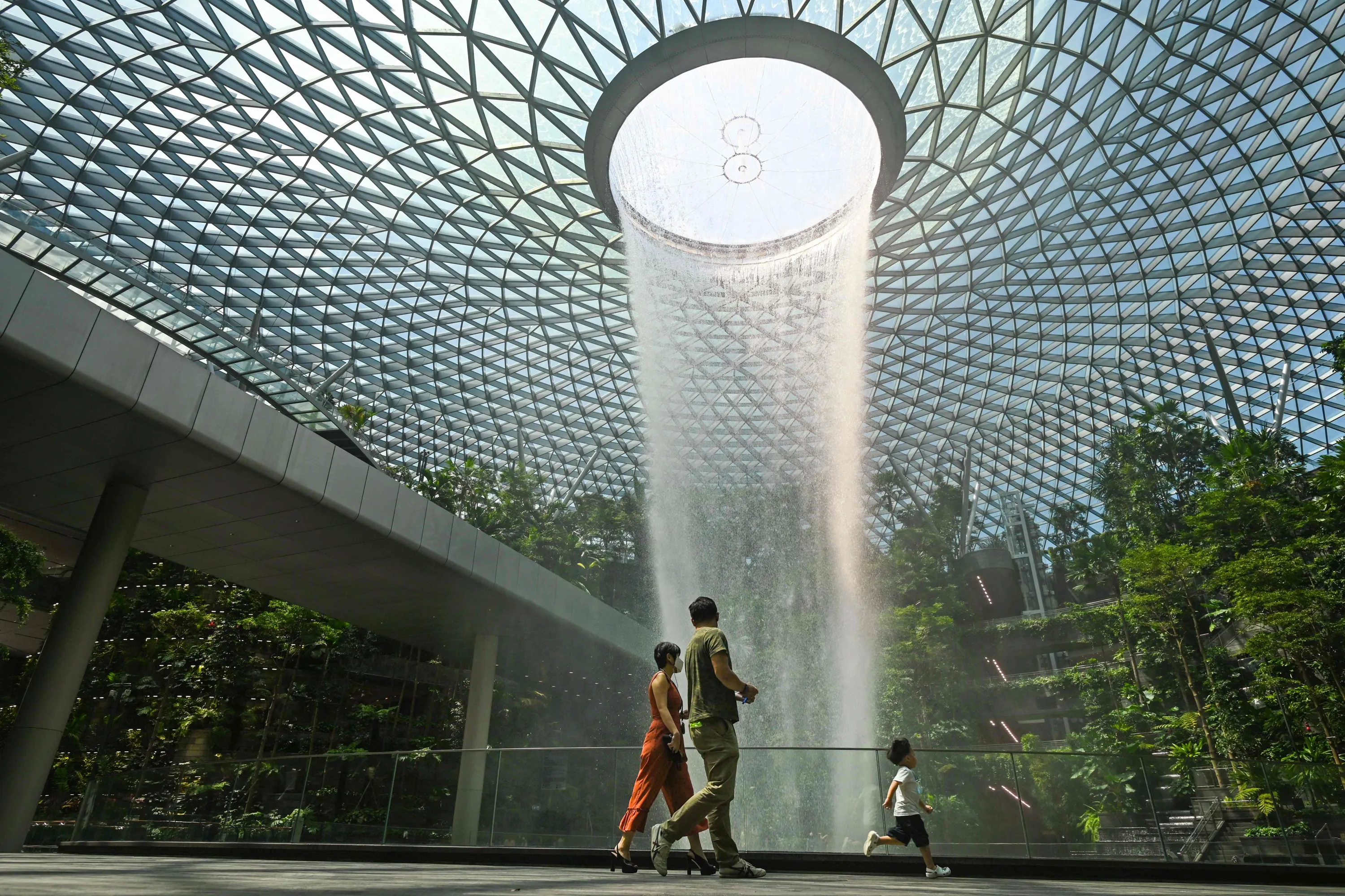 A family walks past the rain vortex at Jewel Changi Airport in Singapore on June 23, 2021. (Photo by Roslan Rahman/AFP Photo)