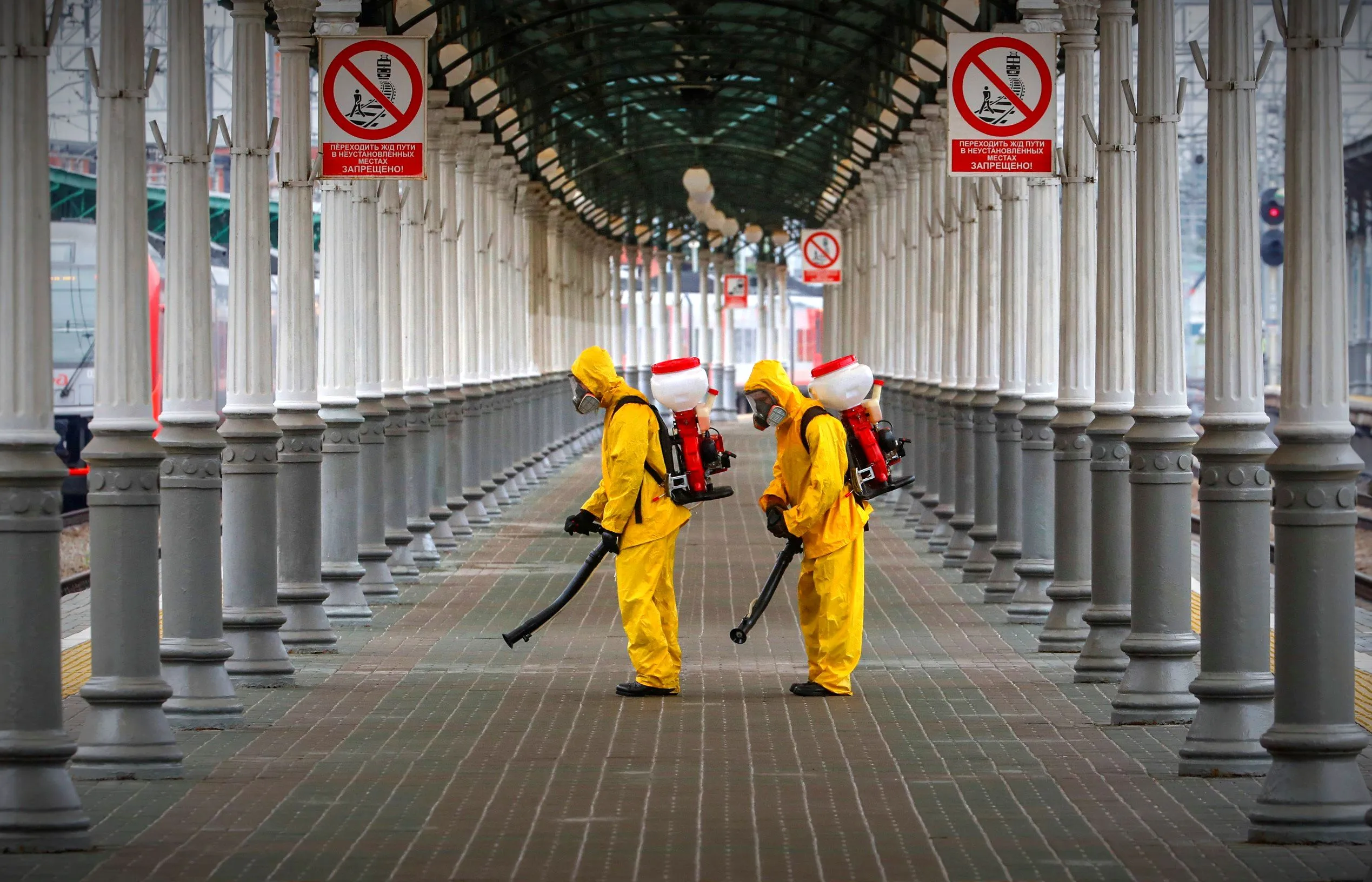 Russian Emergency Situations Ministry workers sanitise Belorussky railway station as part of the campaign to prevent the spread of the SARS-CoV-2 coronavirus which causes the COVID-19 disease in Moscow, Russia, 11 June 2020. For the first time since February, more than 12 thousand cases of COVID-19 have been identified in Russia. (Photo by Sergei Ilnitsky/EPA/EFE)