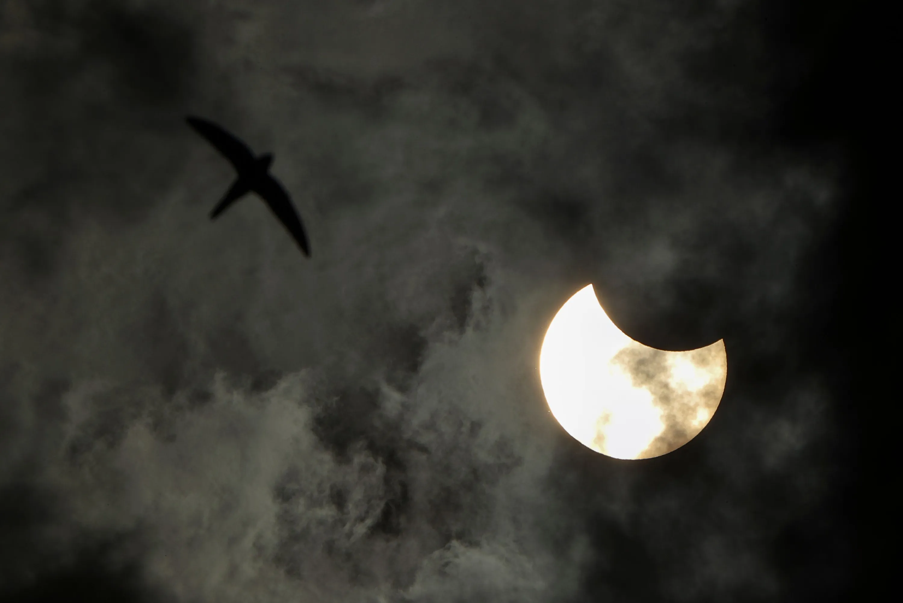 A bird flies next to a partial solar eclipse in St Petersburg, Russia on June 10, 2021. (Photo by Peter Kovalev/TASS)