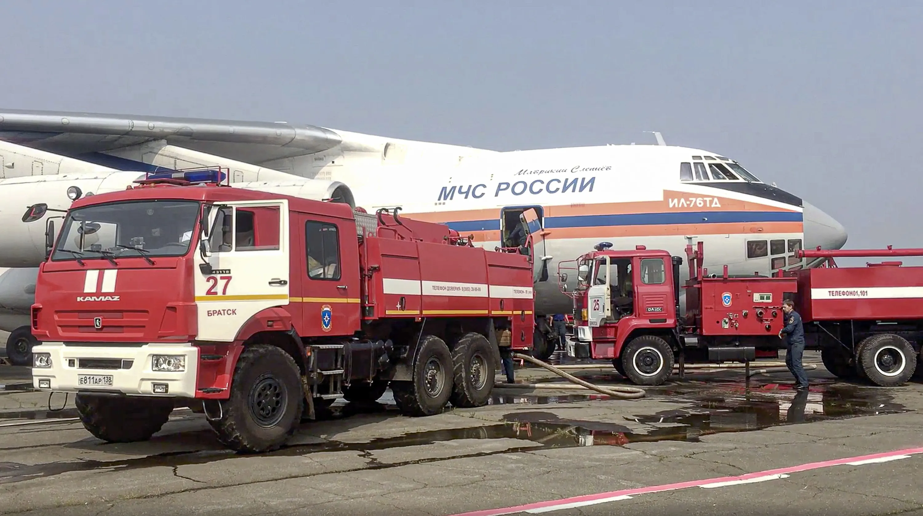This image taken from video provided by the Russian Emergency Ministry Sunday, June 13, 2021 shows a IL-76 aircraft loading with water at an airfield in Irkutsk region. To eliminate the emergency situation associated with forest fires in the Katangsky region, an Il-76 aircraft of the Ministry of Emergencies of Russia arrived in the Irkutsk region. As of the morning of June 13, 2021, about 13 wildfires are active in the region on a total area of 34149.4 hectares. (Photo by Russian Emergency Ministry Press Service via AP Photo)