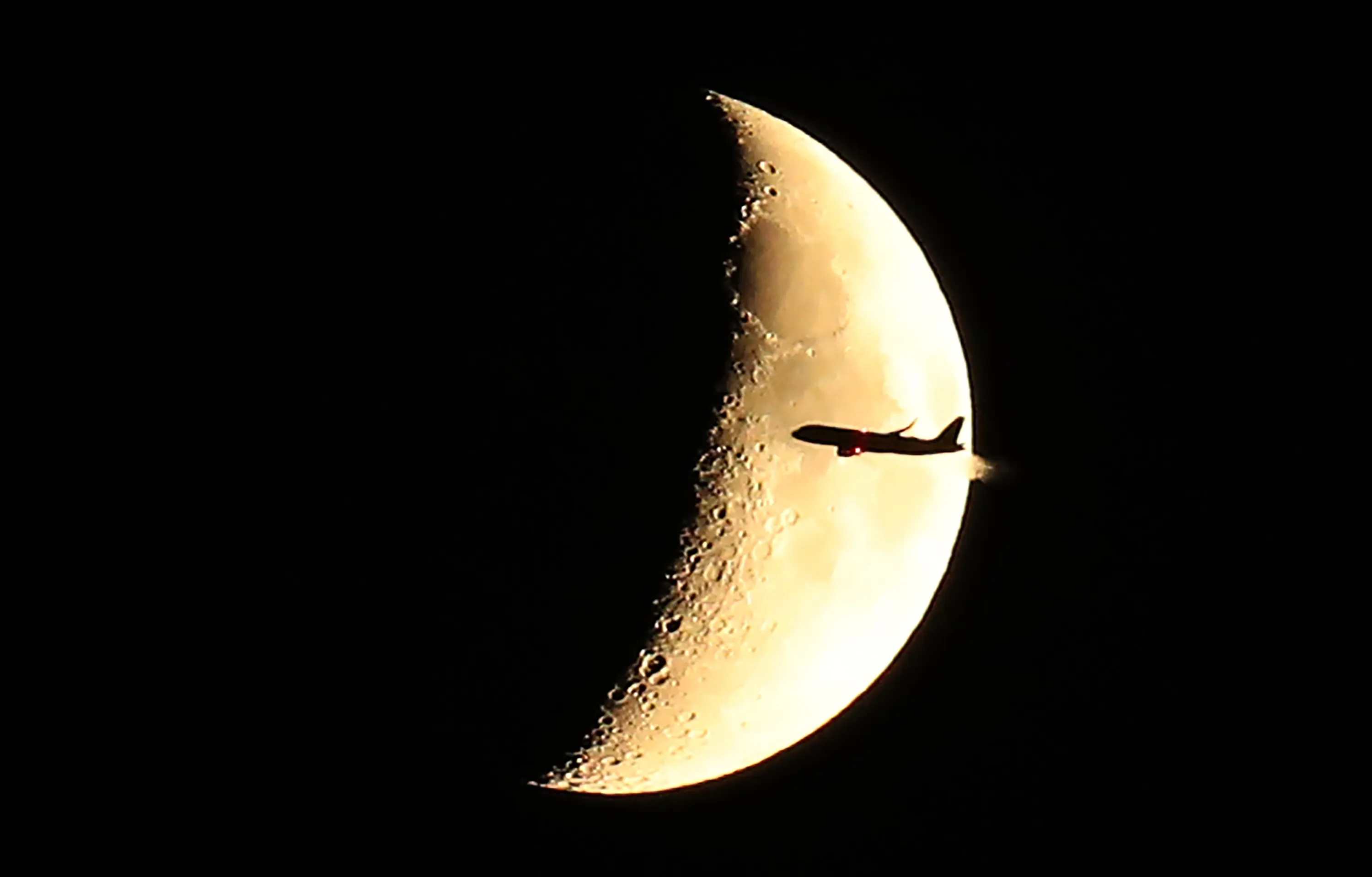 A plane flies past a crescent moon in Moscow, Russia on June 17, 2021. (Photo by Sergei Savostyanov/TASS)