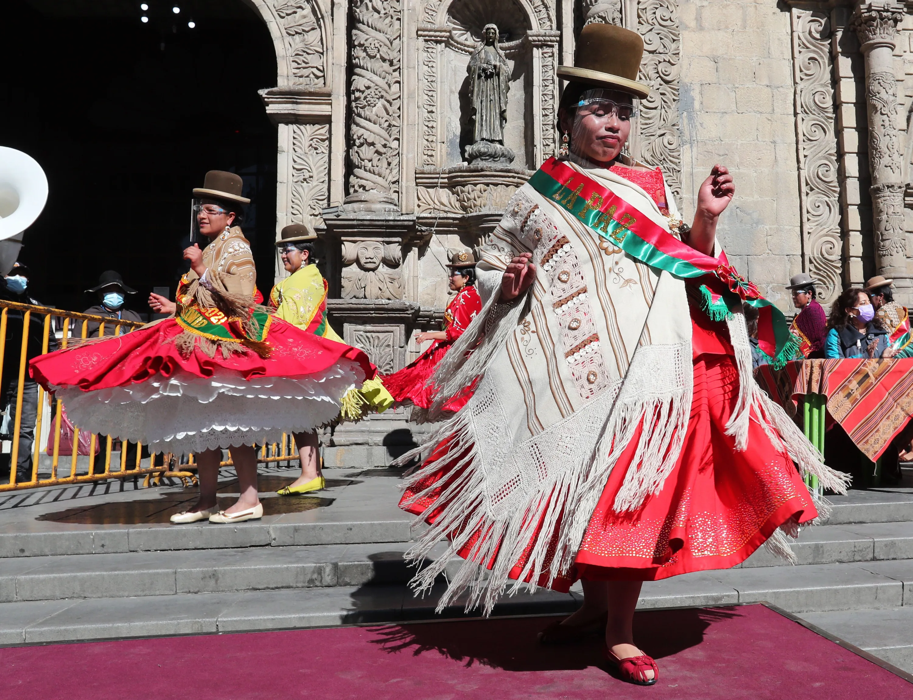 Candidates for “Cholita Pacena” participate in their official presentation to the beauty pageant, in La Paz, Bolivia, 24 June 2021. La Paz will choose the “Cholita Pacena 2021” and the “Cholita Kurmi” among a score of young Aymara women, in a beauty contest in recognition of the identity of these emblematic women who are the cultural heritage of the city, the seat of the Government and the Bolivian Parliament. Dressed in the traditional borsalino hats or bowlers, wide skirts, elegant blouses and blankets and with long hair gathered in two braids, the young candidates were presented at an event in the Plaza Mayor of San Francisco, one of the most traditional in the historic center of La Paz. (Photo by Martin Alipaz/EPA/EFE)