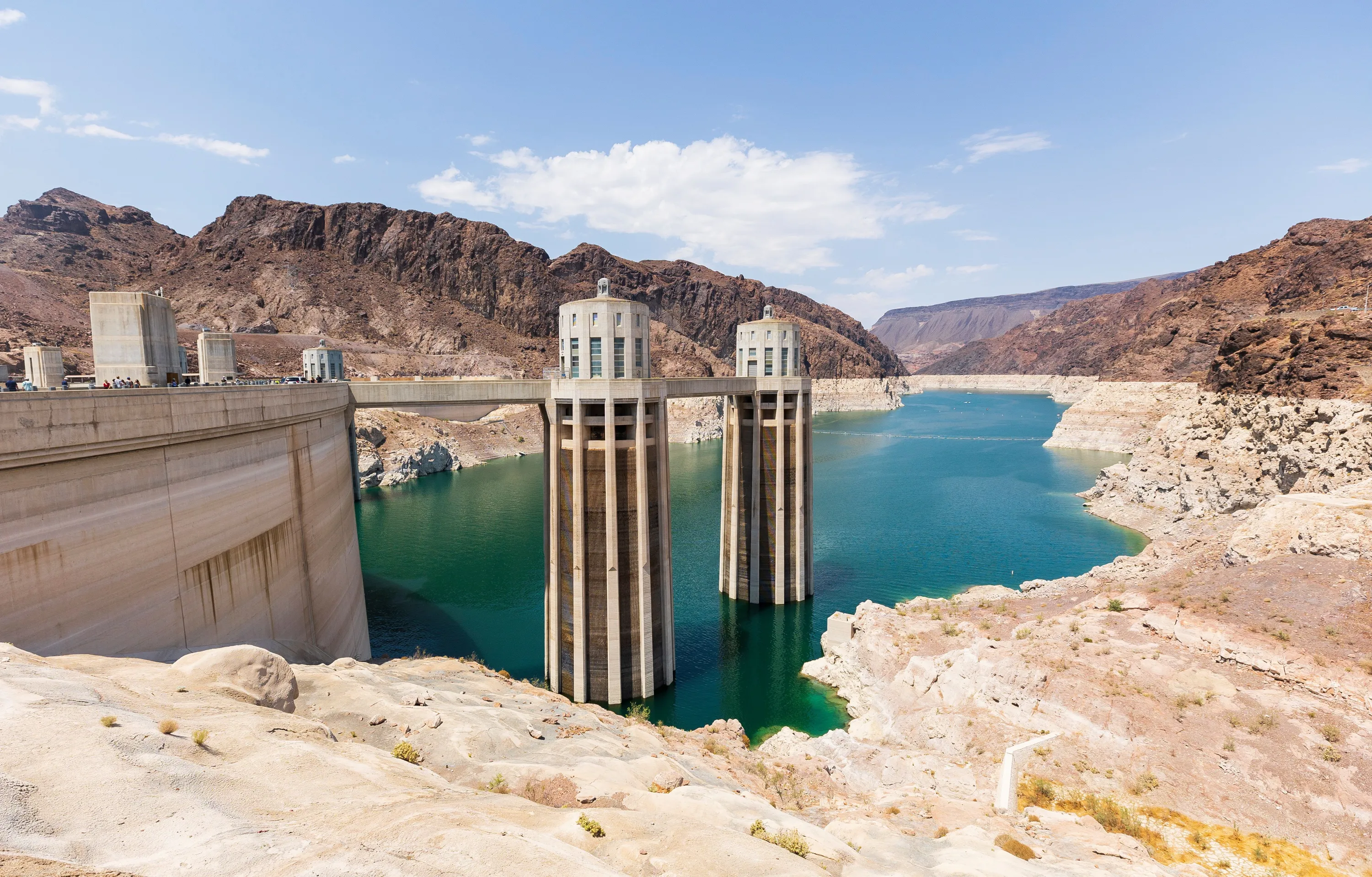 A view of the Hoover Dam and the white ring of mineralized stone indicating the drop in water levels of Lake Mead National Recreation Area in Boulder City, Nevada, USA, 19 June 2021. Lake Mead, the United States' largest reservoir, which was formed by the construction of the Hoover Dam along the Colorado River east of Las Vegas, Nevada on the Nevada/Arizona border, is at the lowest levels ever recorded since being built as a result of drought, high temperatures and water usage. (Photo by Justin Lane/EPA/EFE)