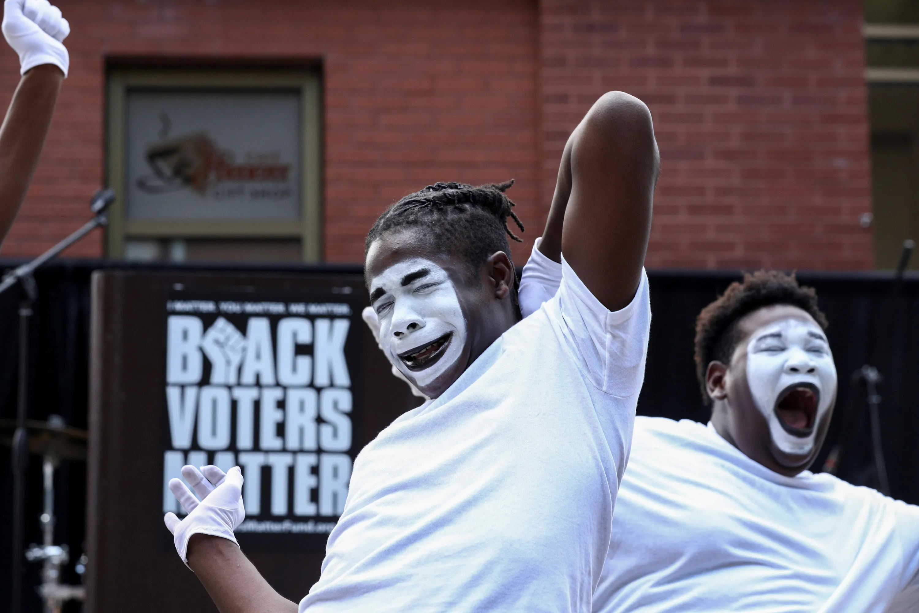 Gospel mime performers dance during a stop on the Freedom Ride For Voting Rights at Ebenezer Baptist Church in Atlanta, Georgia, U.S. June 21, 2021. (Photo by Dustin Chambers/Reuters)