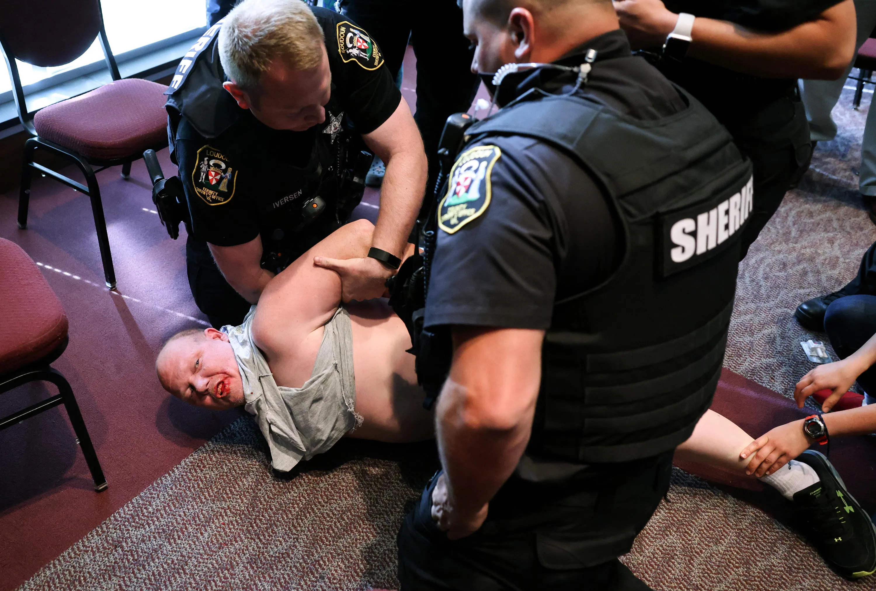 A man is detained after a fight broke out during a Loudoun County School Board meeting which included a discussion of Critical Race Theory and transgender students, in Ashburn, Virginia, U.S. June 22, 2021. (Photo by Evelyn Hockstein/Reuters)