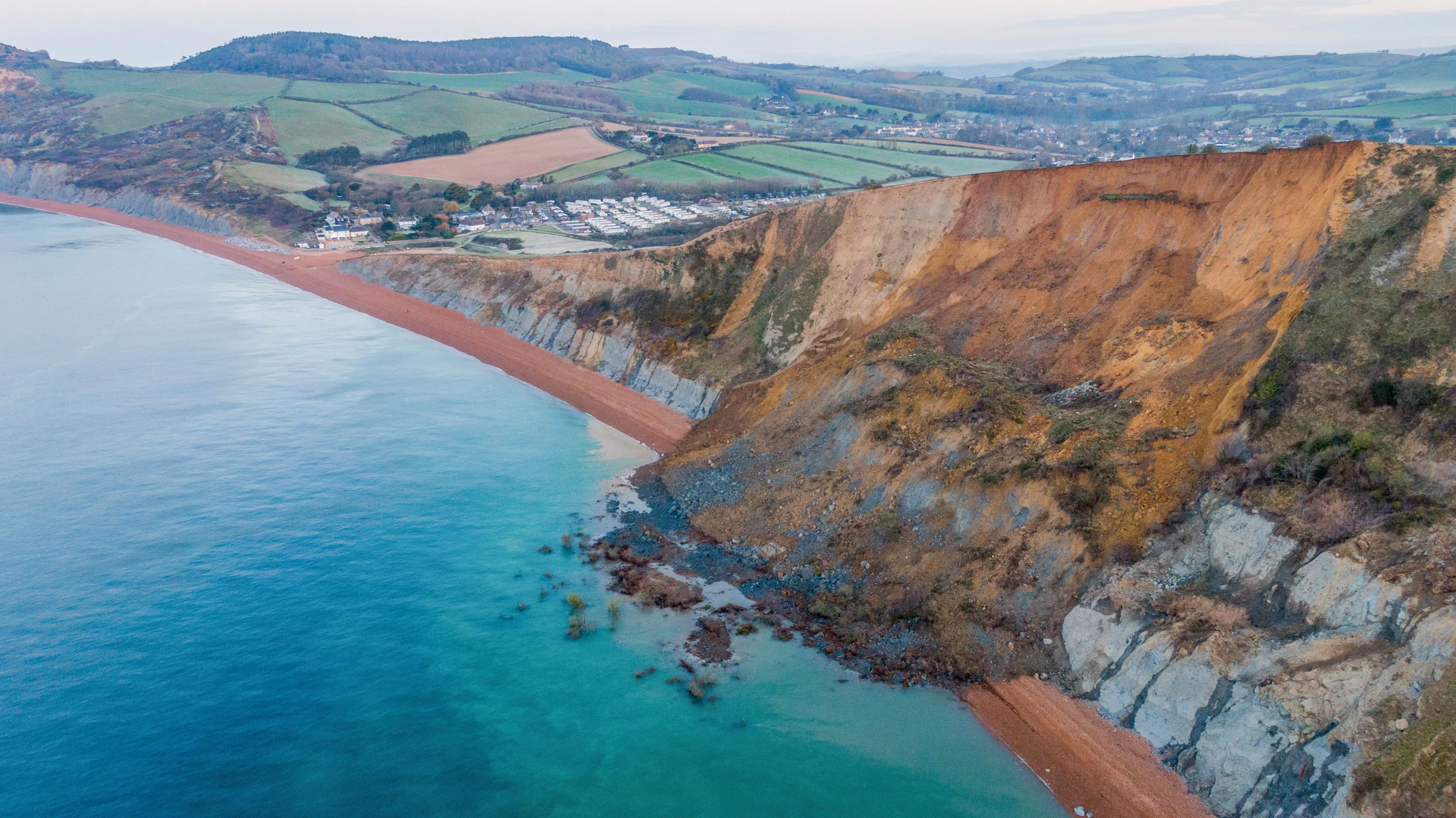 An aerial view of a cliff fall on April 14, 2021 in Seatown, United Kingdom. The 4,000-ton rockfall at Seatown has blocked off the beach between Seatown and Eype Beach, part of Britain's historic Jurassic Coast. The cliff fall is thought to be the biggest in 60 years. Dorset Council has warned that further falls are expected urging residents to stay clear of the area. (Photo by Finnbarr Webster/Getty Images)