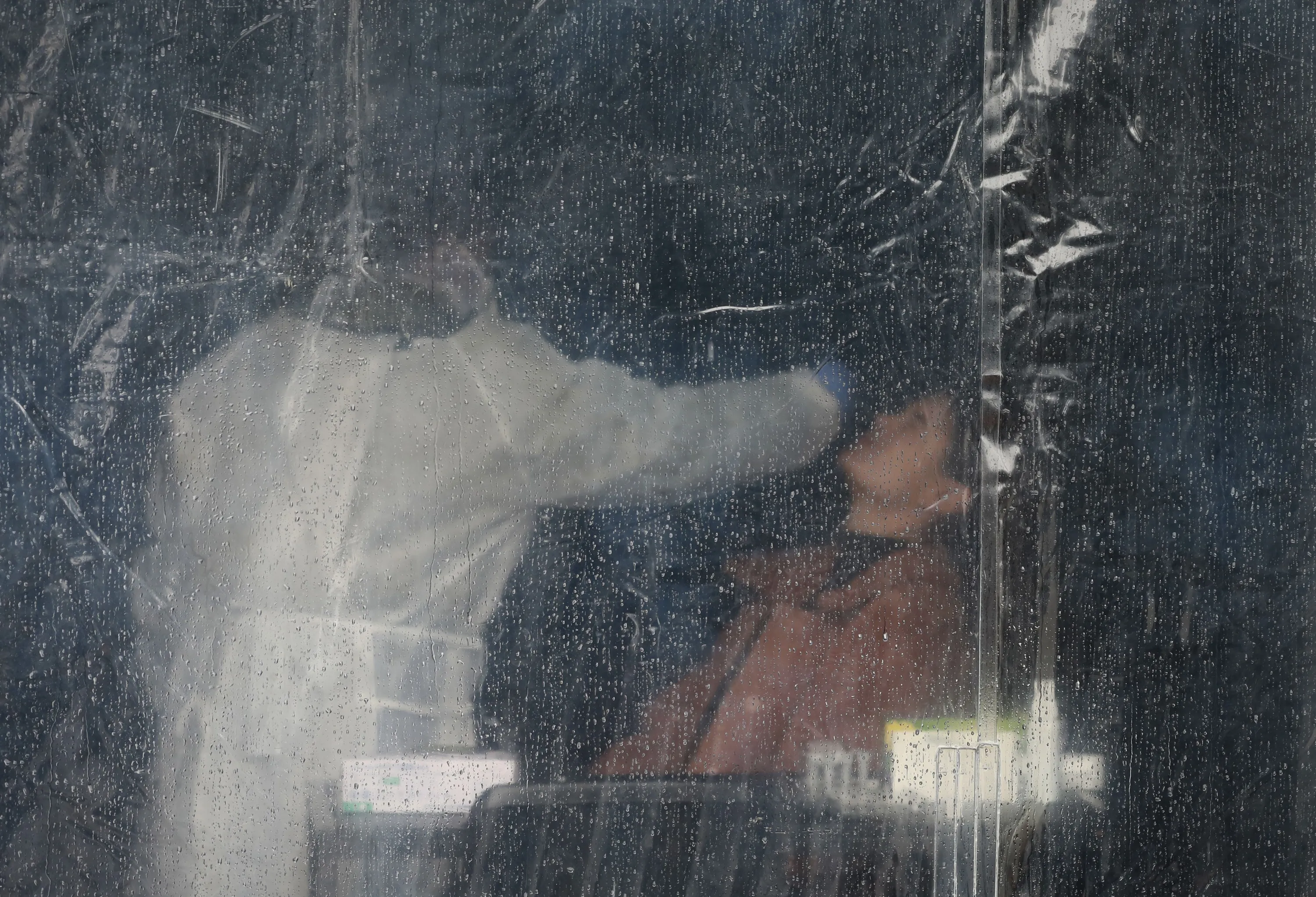 A nurse performs a COVID-19 test at a rapid testing site on a rainy day in Cape Town, South Africa, Thursday, June 17, 2021. The head of the World Health Organization, Tedros Adhanom Ghebreyesus, said Monday, June 21, 2021 the U.N. agency is in discussions with numerous companies and institutions to create a technology transfer hub for coronavirus vaccines in South Africa. (Photo by Nardus Engelbrecht/AP Photo)