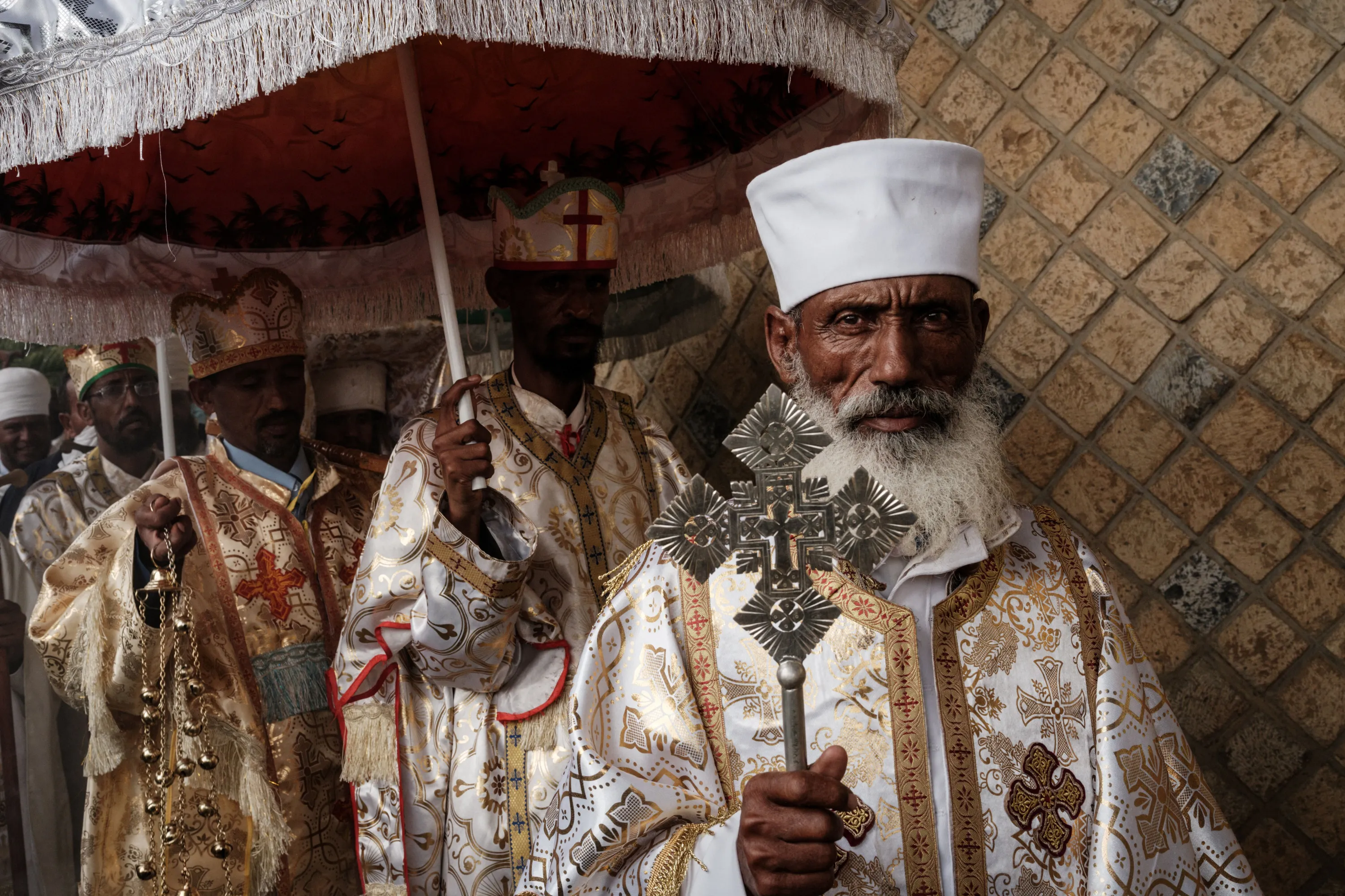Ethiopian Orthodox priests walk around the church during the Saint Michael's anniversary celebration at St. Michael church in Mekele, the capital of Tigray region, Ethiopia, on June 19, 2021. (Photo by Yasuyoshi Chiba/AFP Photo)