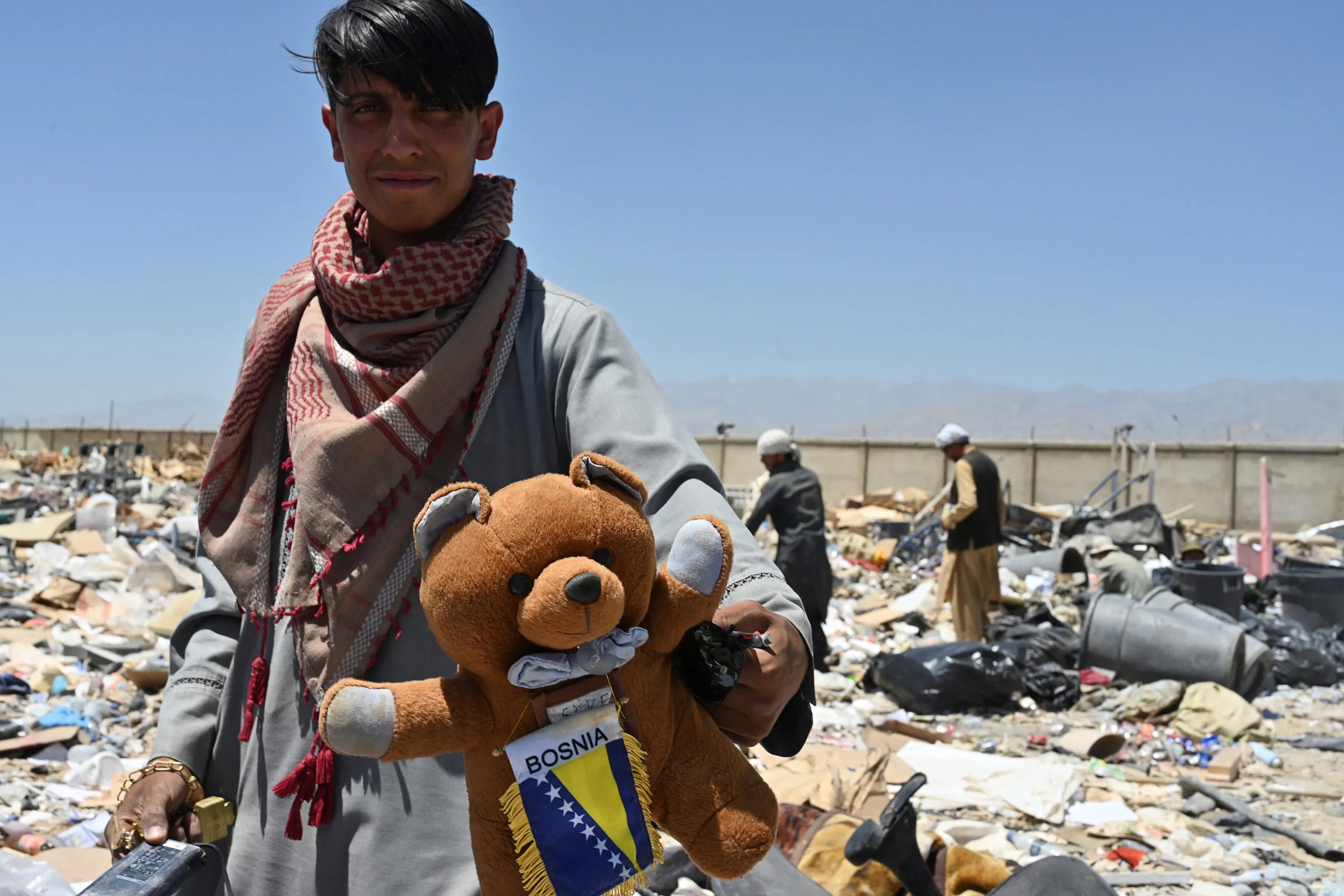 In this picture taken on June 17, 2021, a man holds a teddy bear as people look for useable items at a junkyard near the Bagram Air Base in Bagram. The Pentagon is evacuating Bagram airbase as part of its plan to withdraw all forces by this year's 20th anniversary of the September 11 attacks on the US, taking military gear home or given to Afghan security forces, but tons of civilian equipment must be left behind. (Photo by Adek Berry/AFP Photo)