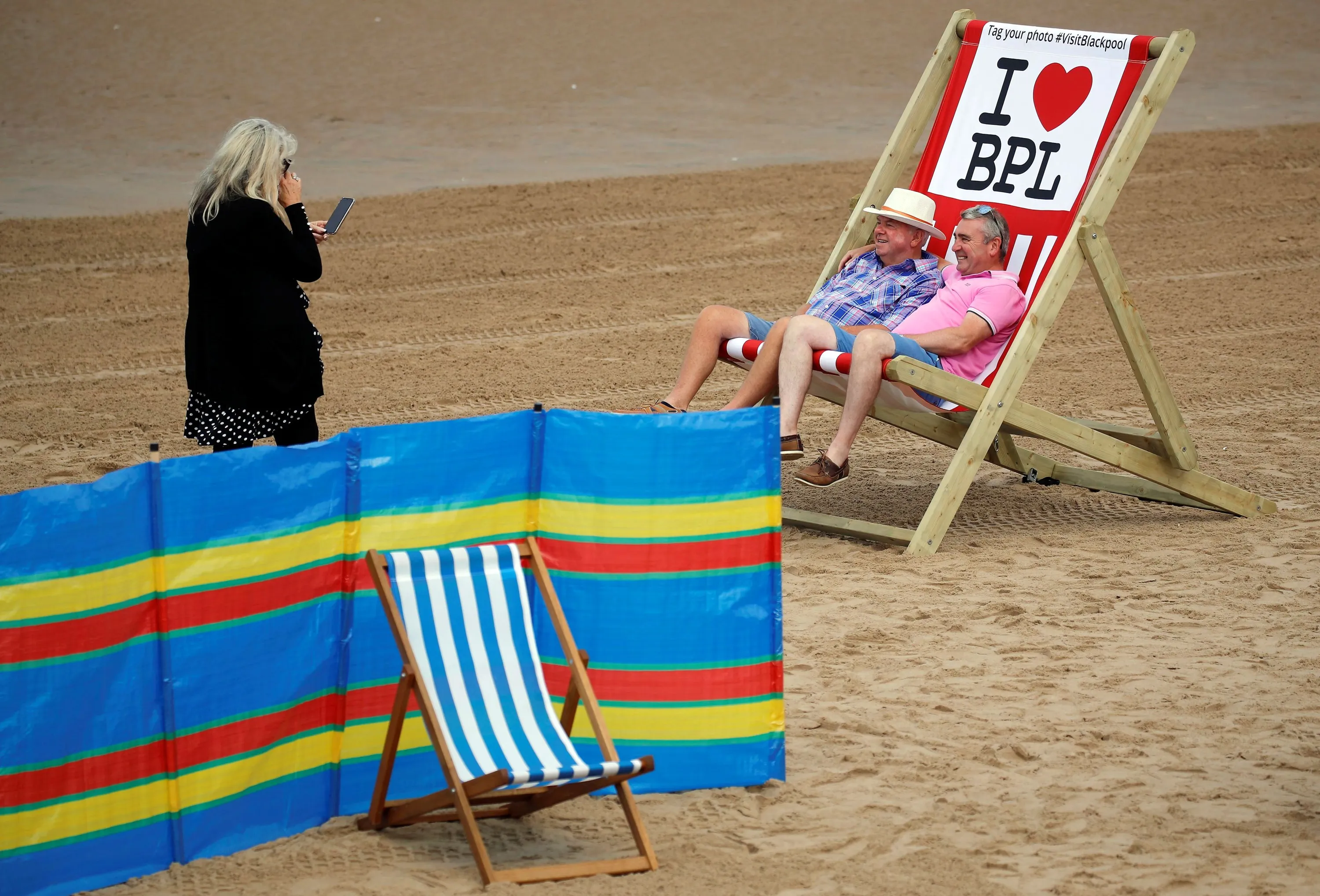 People pose for a photograph in a giant deckchair as rental deckchairs returned to the seafront after a 10 year absence in Blackpool, Britain, June 29, 2021. (Photo by Phil Noble/Reuters)