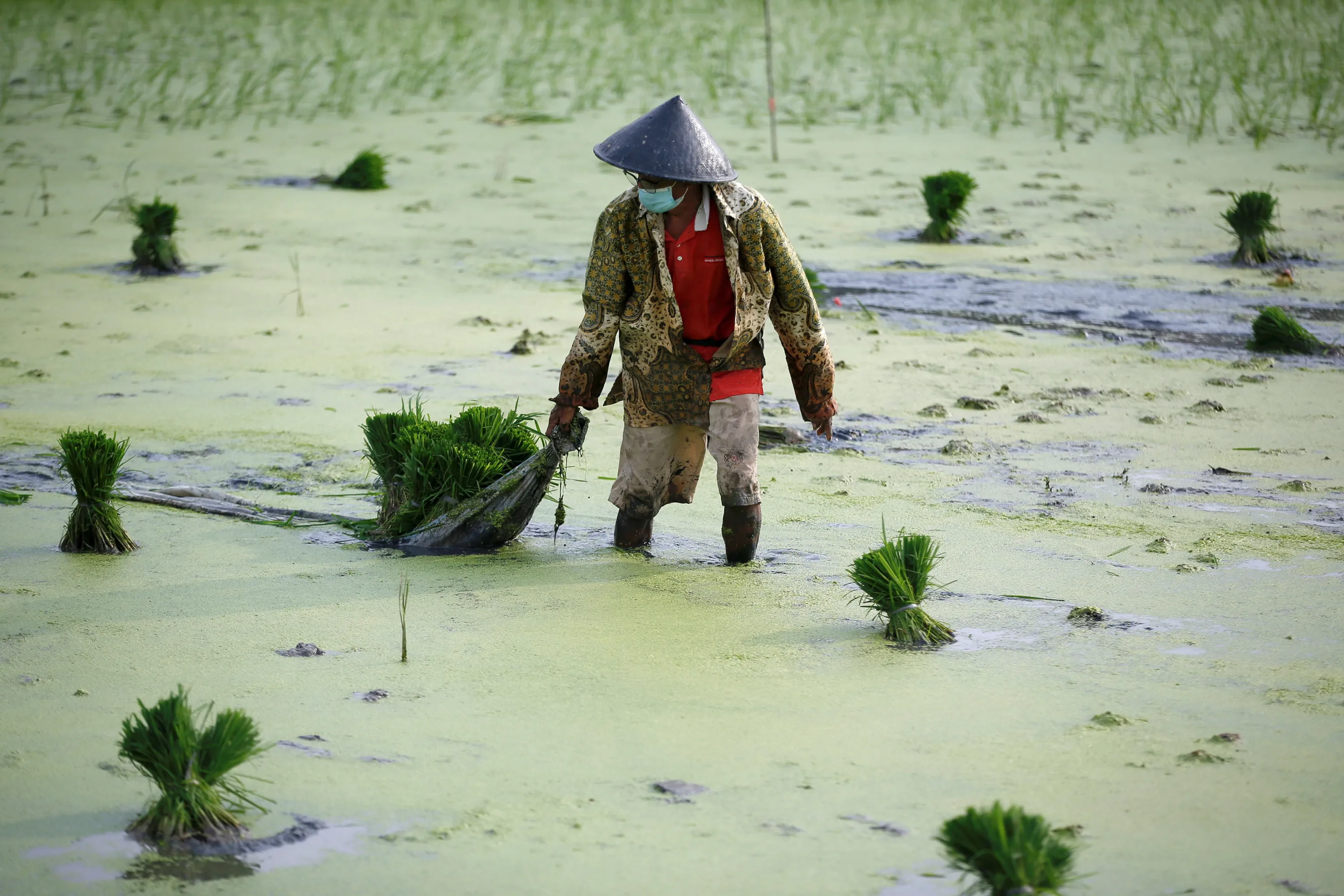 A farmer wearing a protective mask to curb the spread of coronavirus disease (COVID-19) works at a paddy field in Jakarta, Indonesia, June 28, 2021. (Photo by Willy Kurniawan/Reuters)