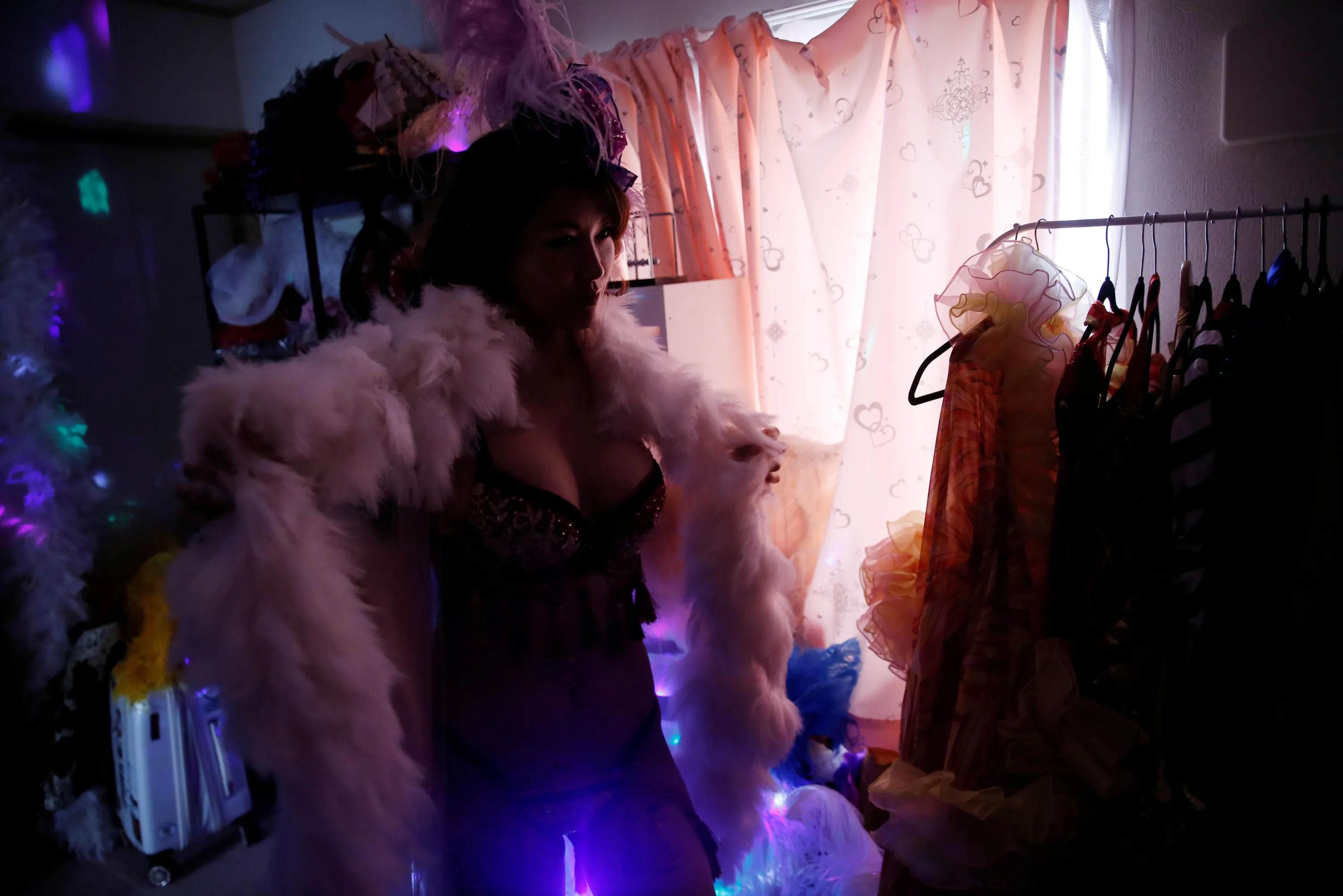 Burlesque show exotic dancer Aya Yumiko who performs under the name Aya Mermaid, tries on her new stage costume which she made at her house, amid the coronavirus disease (COVID-19) outbreak, in Tokyo, Japan, April 21, 2020. (Photo by Kim Kyung-Hoon/Reuters)
