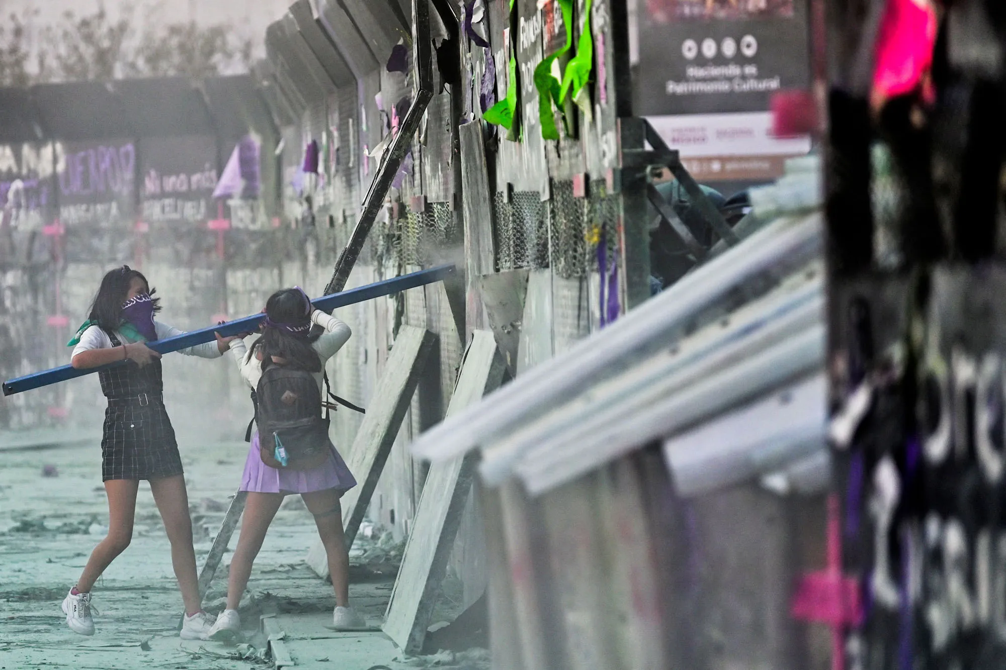 Women clash with the police, behind a fence in front of the National Palace, as they protest during a demonstration to commemorate the International Women's Day in Mexico City, on March 8, 2021. (Photo by Pedro Pardo/AFP Photo)