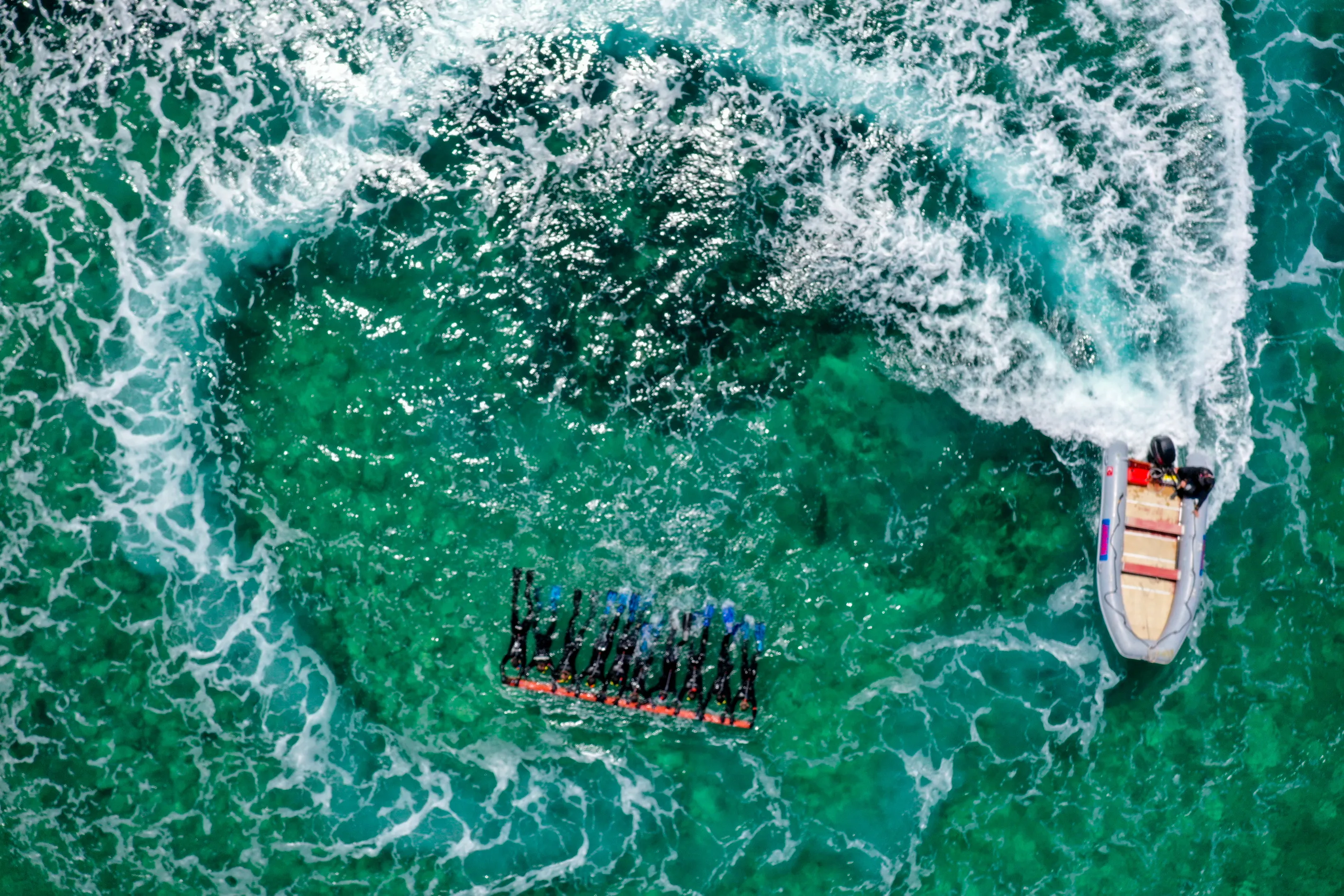 A drone photo shows members of Foca Gendarmerie Commando School and Training Center Command during a military drill offshore Izmir, Turkey on June 23, 2021. (Photo by Halil Fidan/Anadolu Agency via Getty Images)