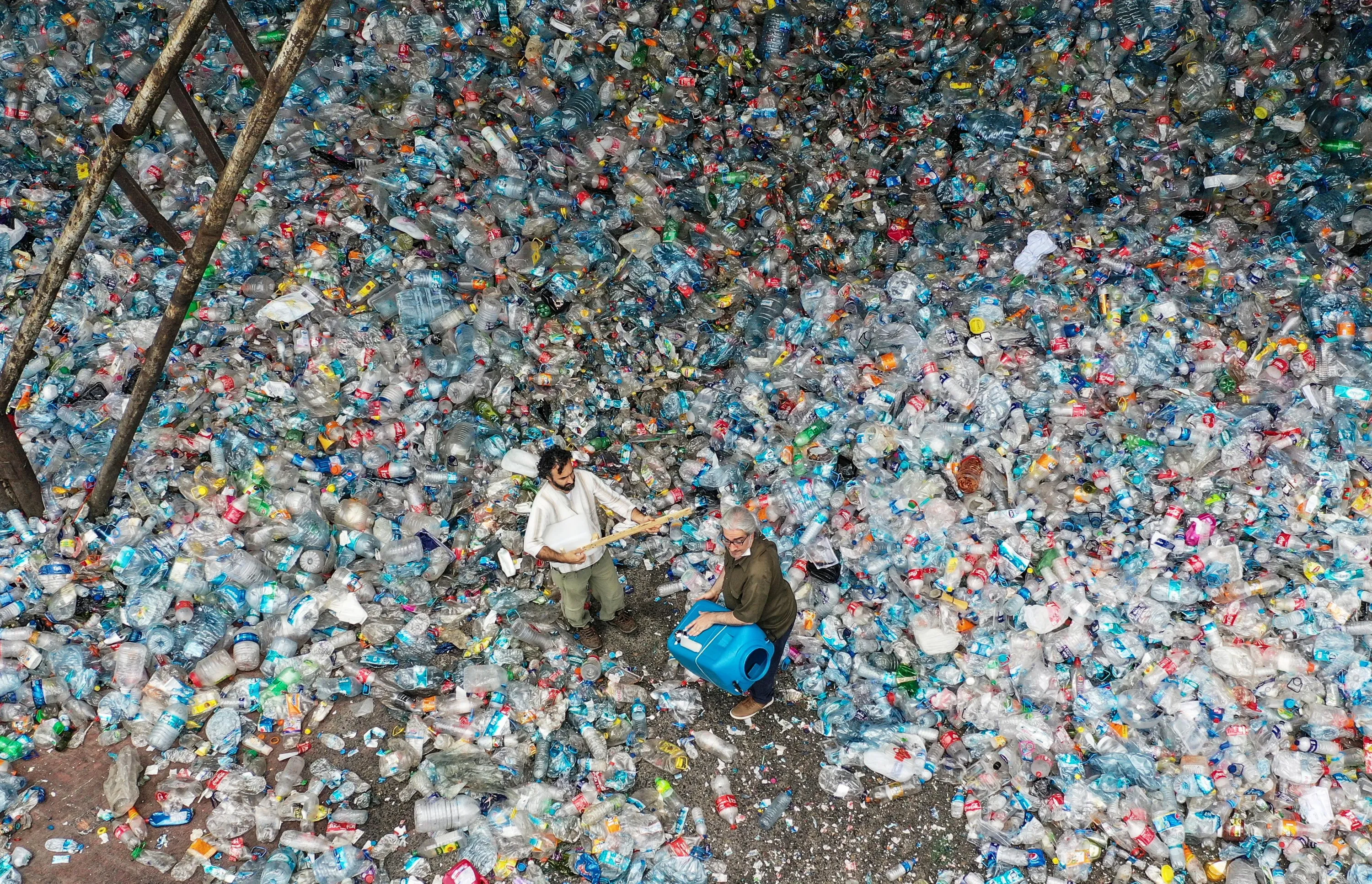 Musicians Roni Aran and Herman Artuc, members of the ethnic instrumental music band of Fungistanbul, perform with instruments made by materials collected from landfills, at a recycling depot in Istanbul, Turkey on June 17, 2021. (Photo by Umit Bektas/Reuters)