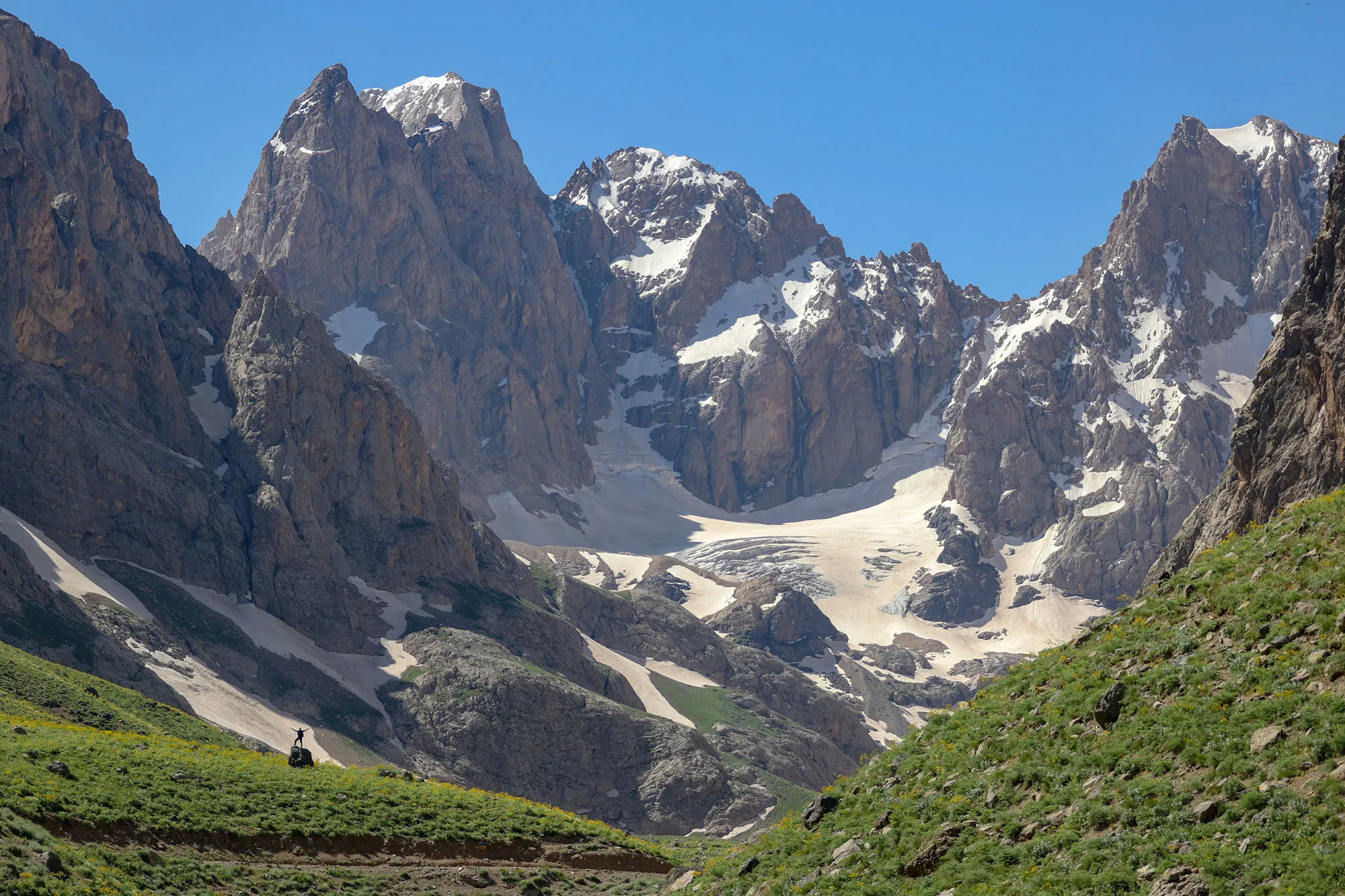 Nature and photography lovers visit Mount Cilo in Turkey's Eastern Anatolian province Hakkari on June 09, 2021. Cilo Mountains located on Ikiyaka mountains declared “National Park” is one of the natural beauty spots for travelers in Hakkari's Yuksekova district. 27,500 hectares of national park area draws attention coexisting four seasons with colorful flowers and snow on top of hills. Uludoruk, the second highest mountain in Turkey, located on Cilo Mountains, is often visited due to its waterfalls, glacial lakes and snow. (Photo by Ozkan Bilgin/Anadolu Agency via Getty Images)