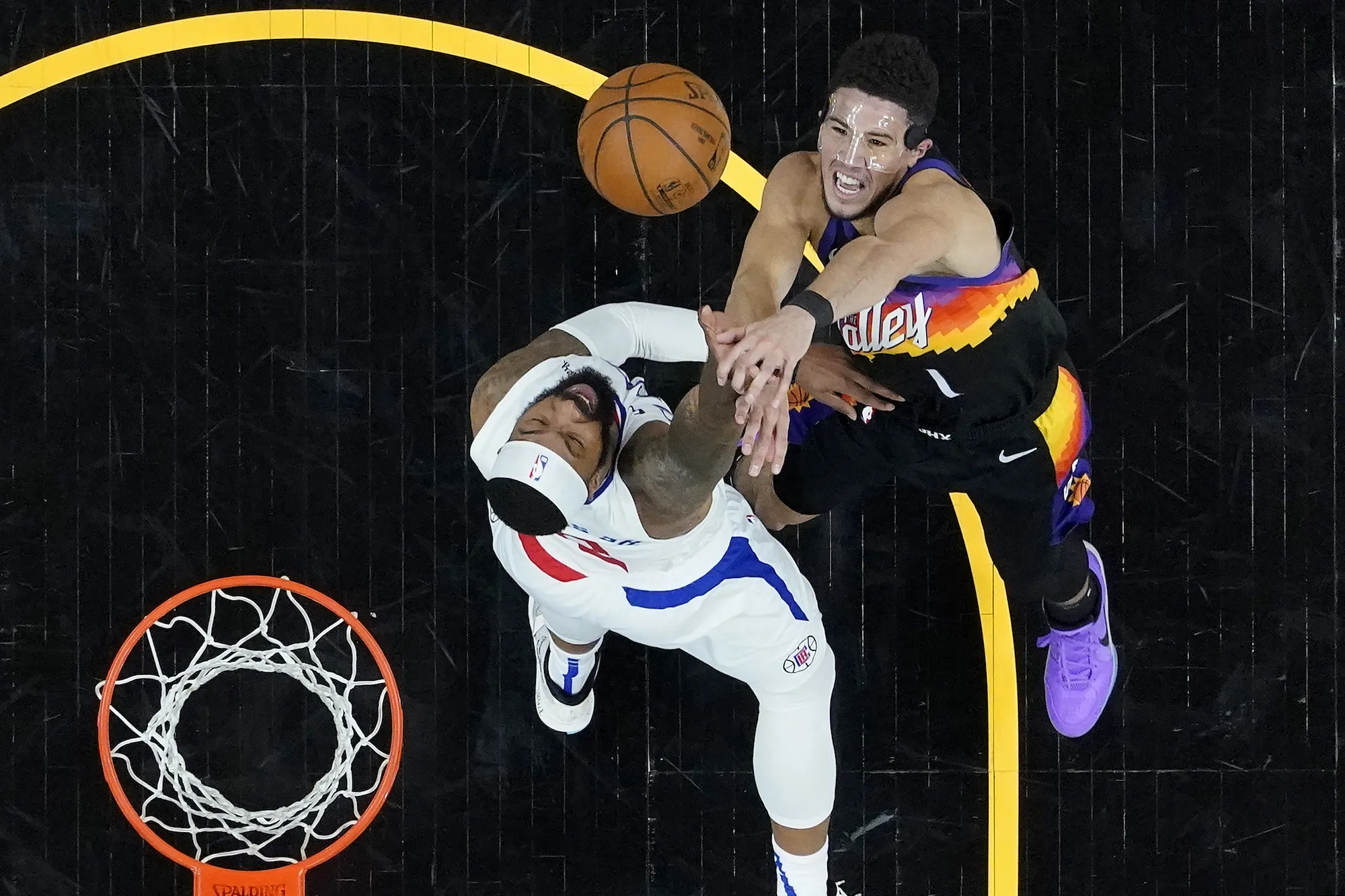 Phoenix Suns guard Devin Booker (1) shoots over Los Angeles Clippers forward Marcus Morris Sr. during the second half of game 5 of the NBA basketball Western Conference Finals, Monday, June 28, 2021, in Phoenix. (Photo by Matt York/AP Photo)