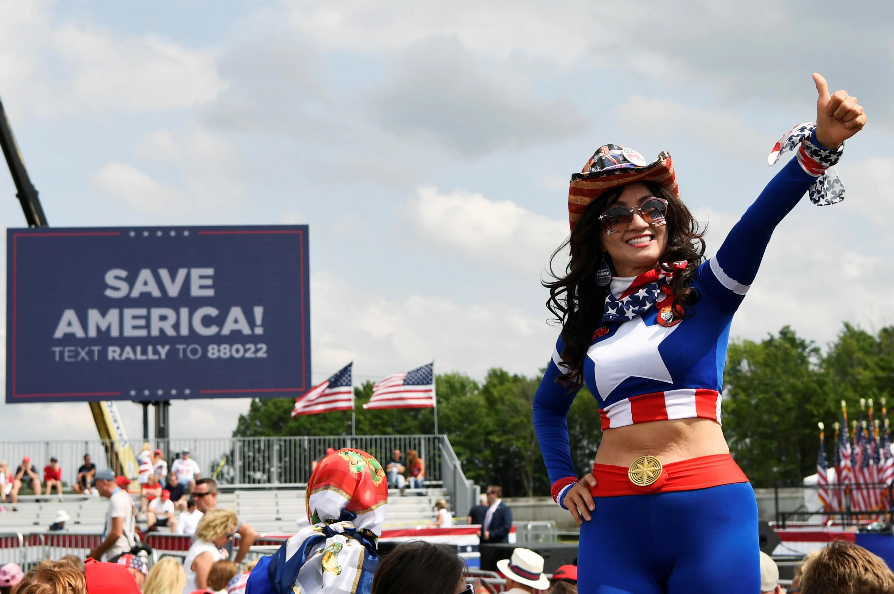 A supporter of former U.S. President Donald Trump gives a thumbs-up during his first post-presidency campaign rally at the Lorain County Fairgrounds in Wellington, Ohio, U.S., June 26, 2021. (Photo by Gaelen Morse/Reuters)