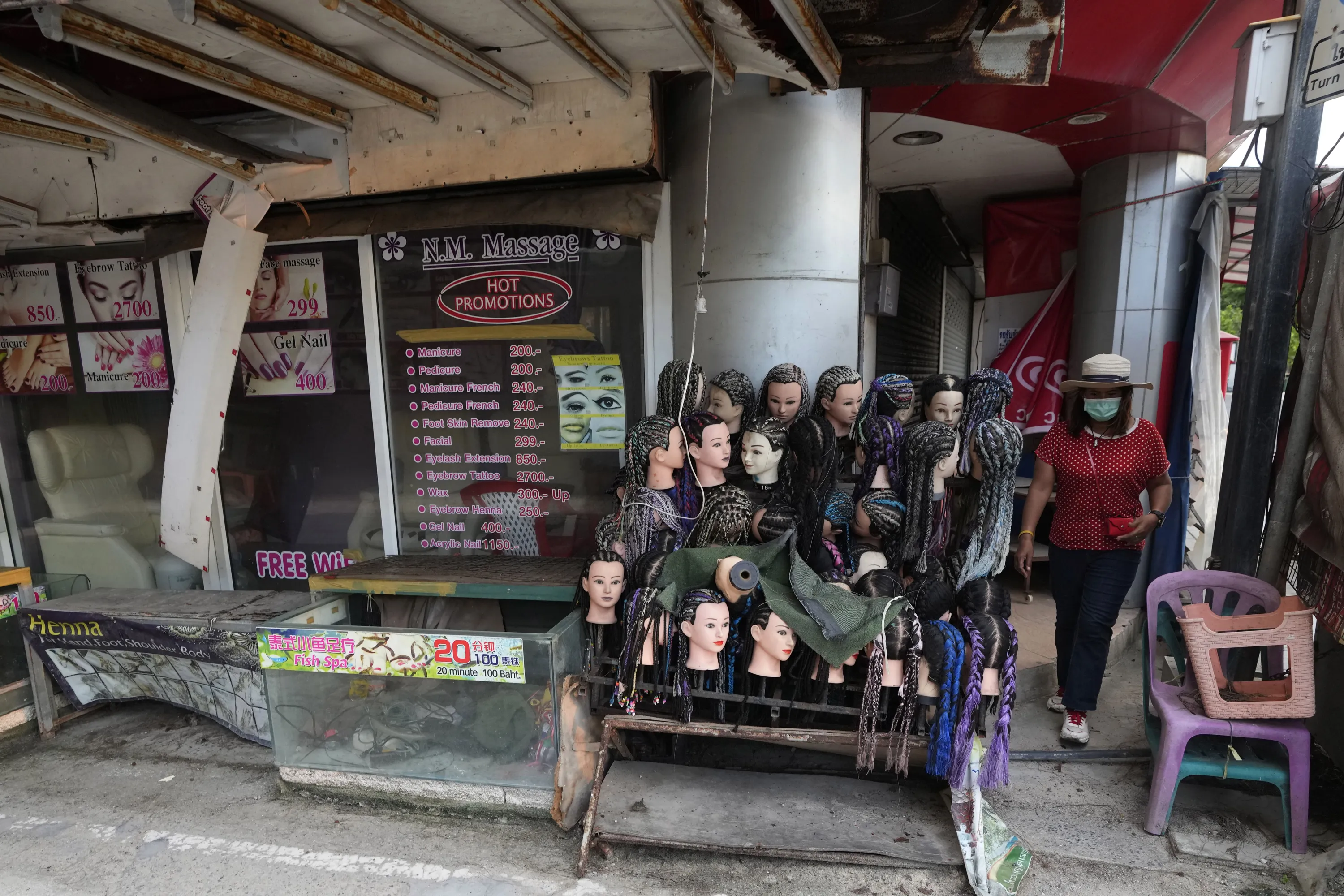 A woman walks past abandoned braided mannequin heads along the normally tourist-packed Patong Beach on Phuket, southern Thailand, June 28, 2021. (Photo by Sakchai Lalit/AP Photo)