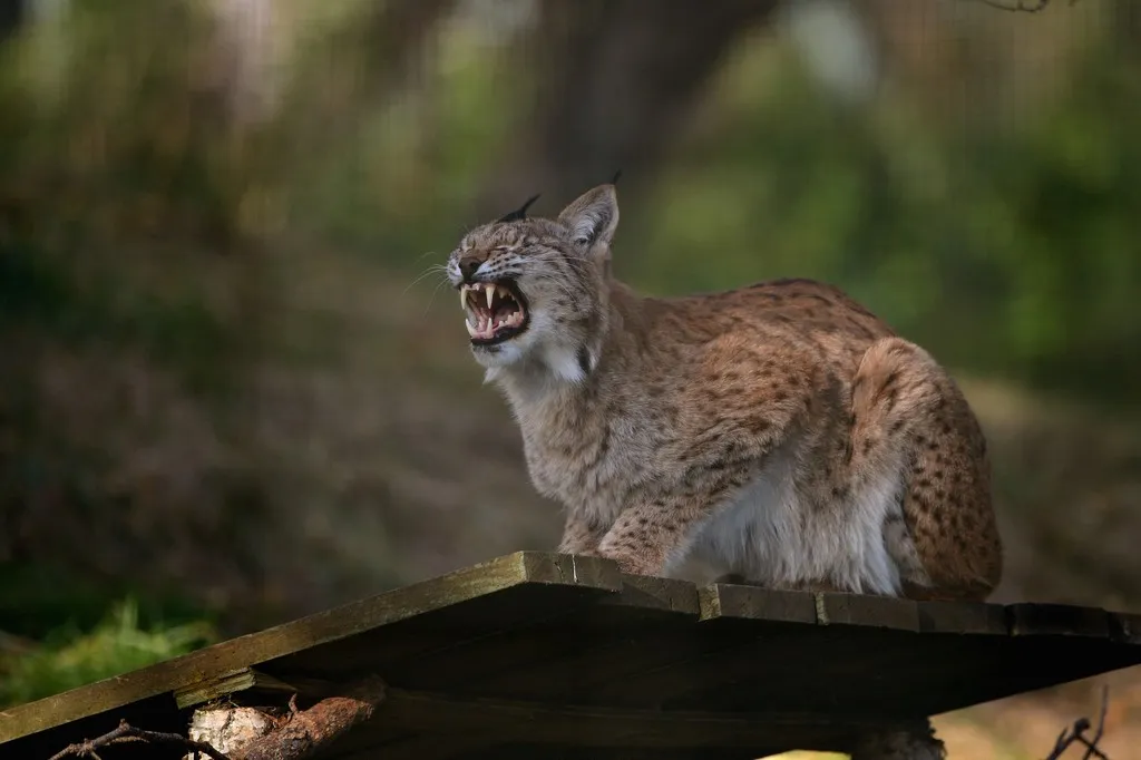 KINGUSSIE, SCOTLAND - OCTOBER 09: The mother of two Northern Lynx kittens yawns as they explore their enclosure at the Highland Wildlife park on October 9, 2012 in Kingussie, Scotland. The feline twins are believed to be the type of lynx found historically in Scotland. The Highland Wildlife Park specialises in Scottish animal species, both past and present, and species that are well adapted to cold weather. (Photo by Jeff J Mitchell/Getty Images)