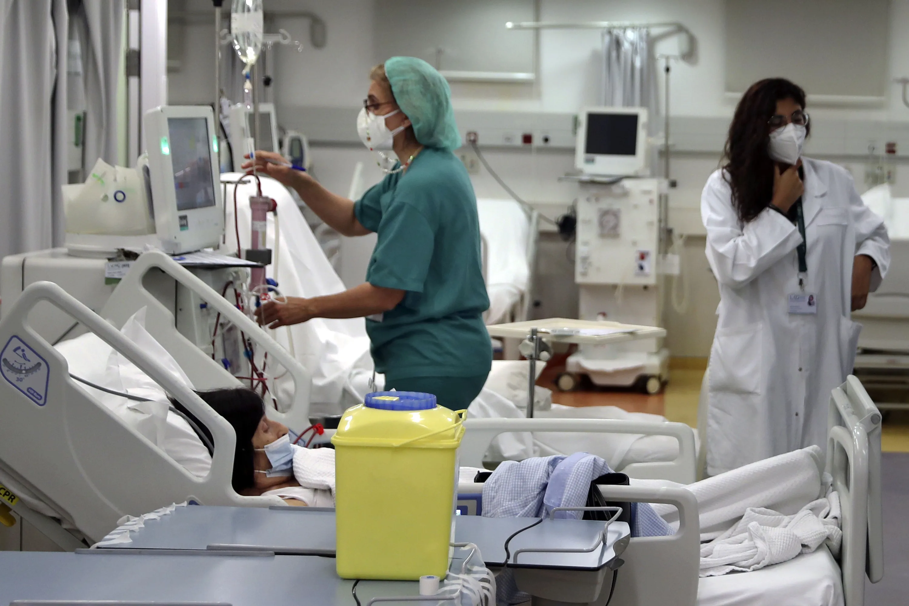 A nurse checks a patient undergoes dialysis at the Lebanese American University Medical Center-Rizk Hospital in Beirut, Lebanon, Thursday, June 10, 2021. Hospitals in Lebanon warned on Thursday that they may be forced to suspend kidney dialysis next week amid severe shortages in supplies needed, the latest manifestation of Lebanon's accelerating financial crisis and collapsing health sector. (Photo by Bilal Hussein/AP Photo)