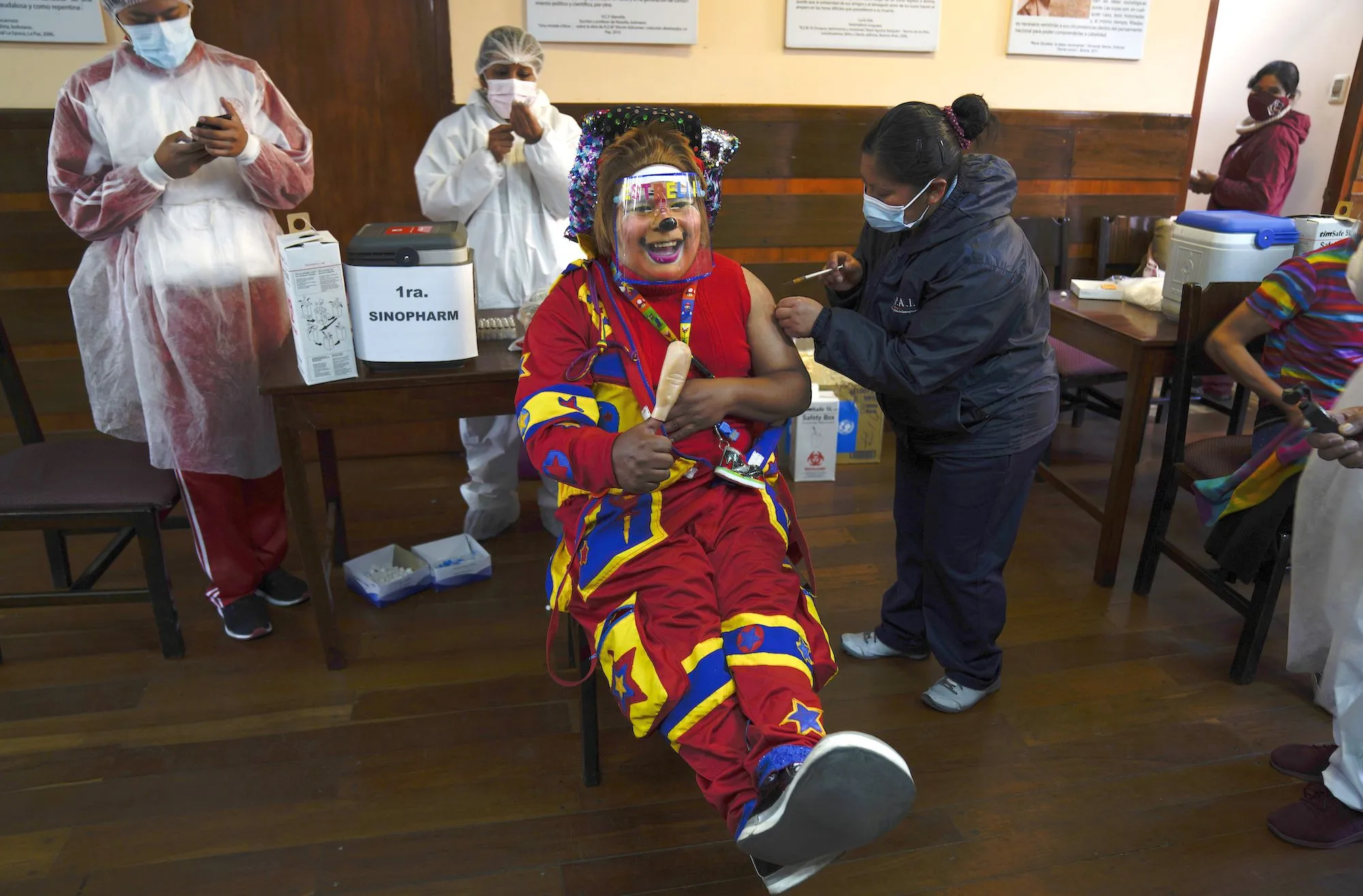 A health worker is injected with the Sinopharm COVID-19 vaccine to a clown during a vaccination campaign for people over 18 at the public University San Andres, in La Paz, Bolivia, Monday, July 5, 2021. (Photo by Juan Karita/AP Photo)