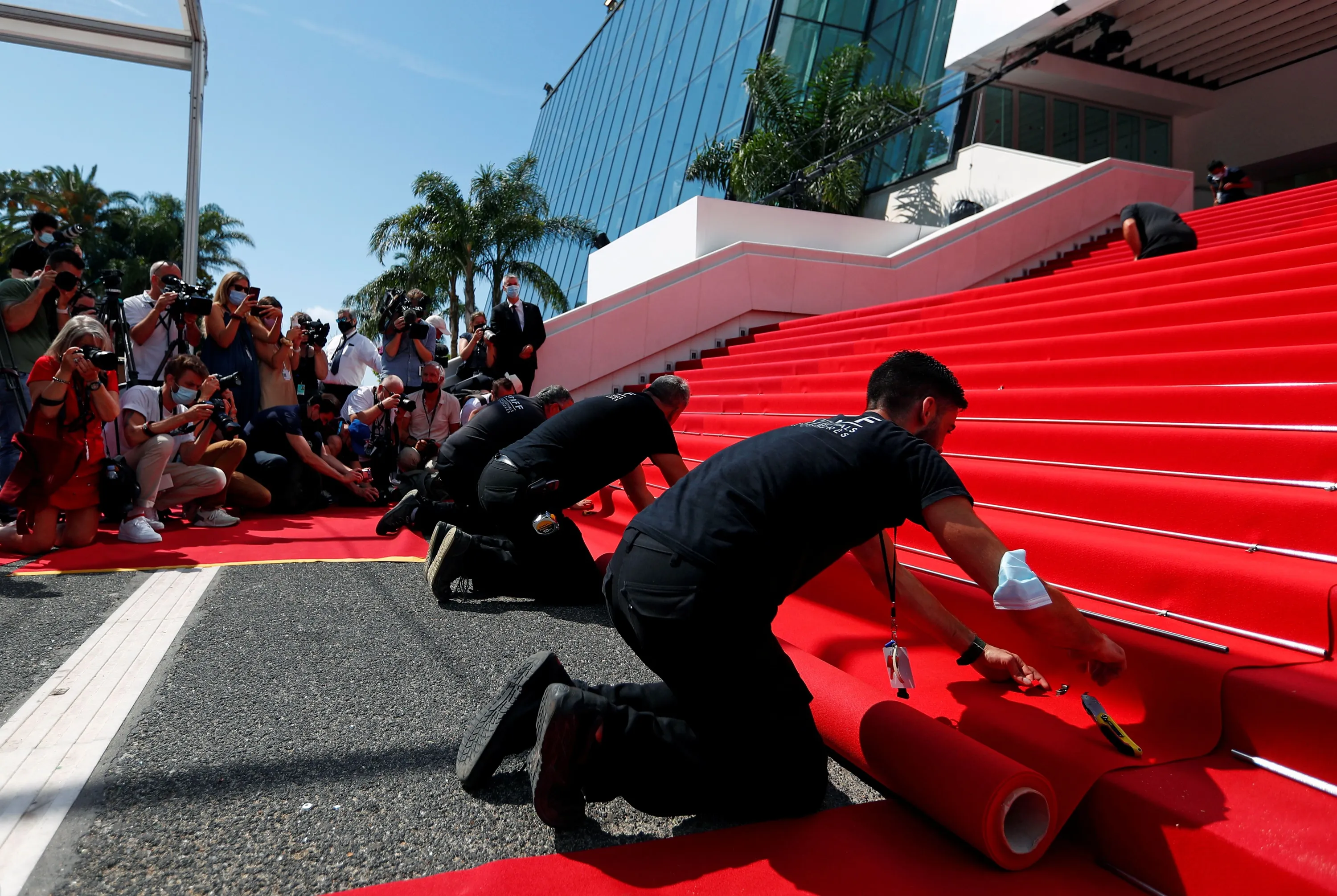Photographers and cameramen watch as workers install the red carpet in front of the main entrance of the Festival Palace before the opening ceremony of the 74th Cannes Film Festival in Cannes, France on July 6, 2021. (Photo by Johanna Geron/Reuters)