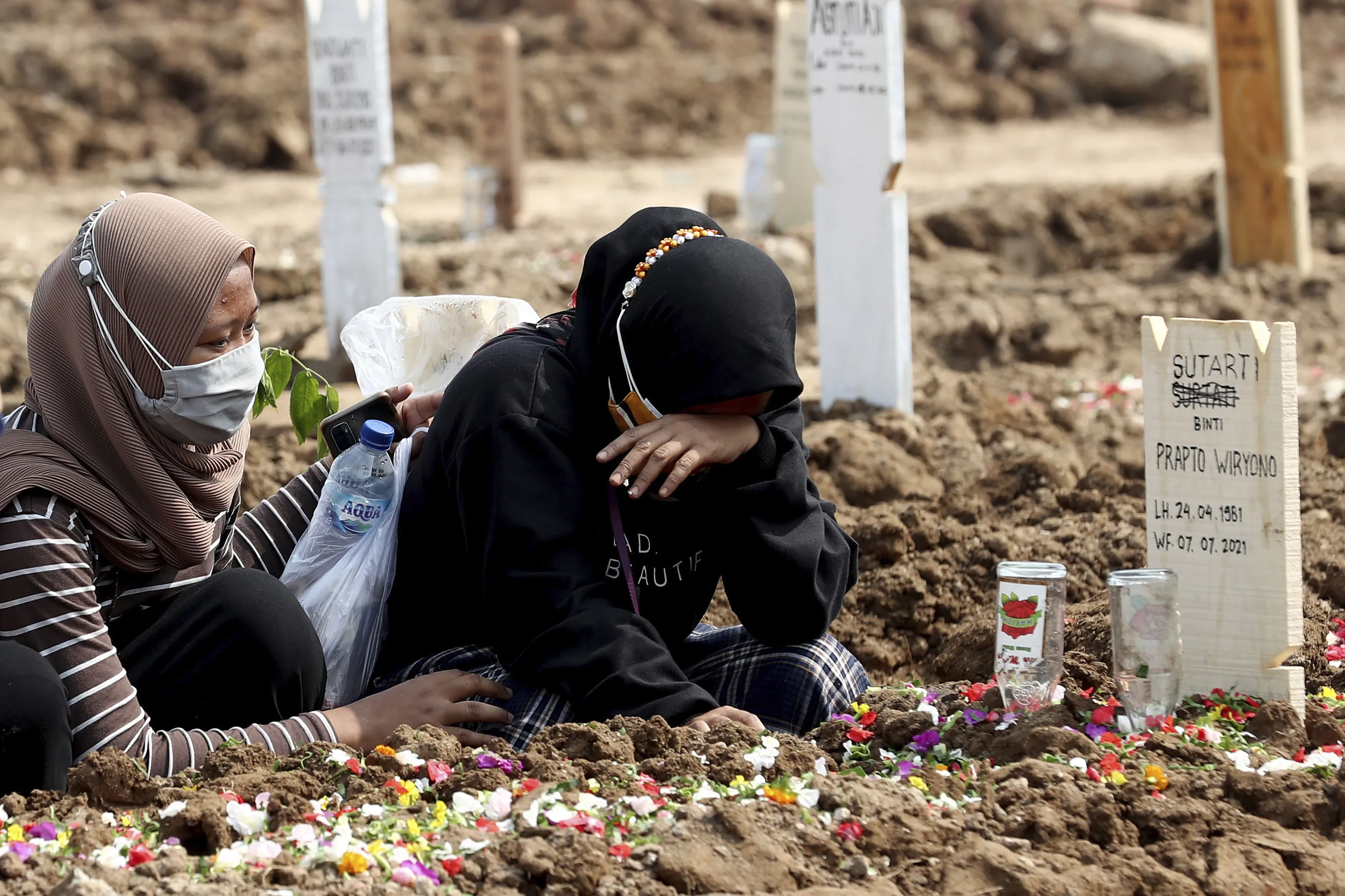 A woman weeps as she visits the grave of a relative at the Rorotan Cemetery which is reserved for those who died of COVID-19, in Jakarta, Indonesia, Wednesday, July 7, 2021. Across the country, the coronavirus pandemic is again spreading rapidly with bursting beyond capacity and oxygen supplies are running out, leaving people do what they can to cope with caring for sick friends and relatives at home. (Photo by Tatan Syuflana/AP Photo)