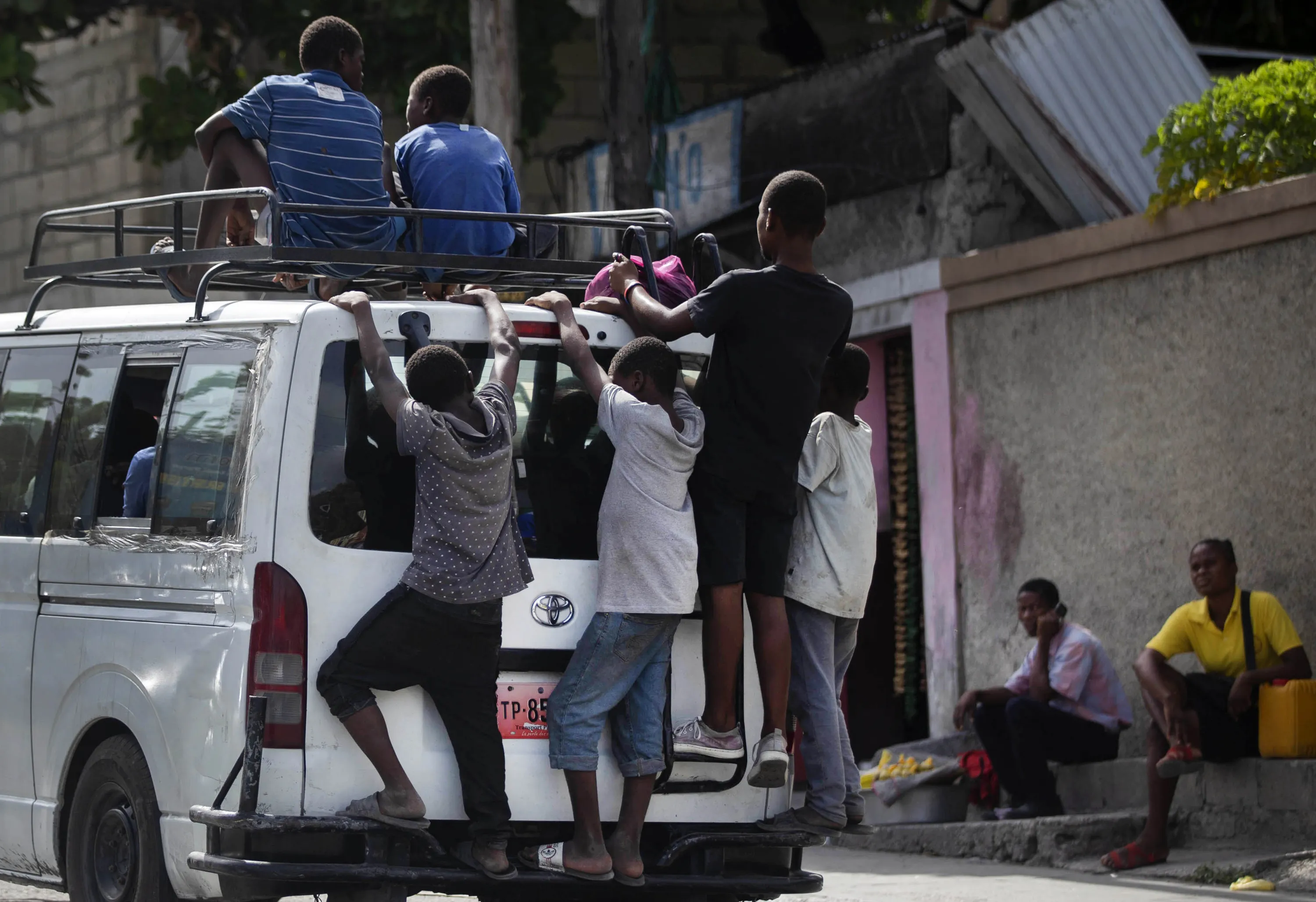 Children ride on the roof and back of a public taxi a day after the murder of President Jovenel Moise, in Port-au-Prince, Haiti, Thursday, July 8, 2021. (Photo by Joseph Odelyn/AP Photo)