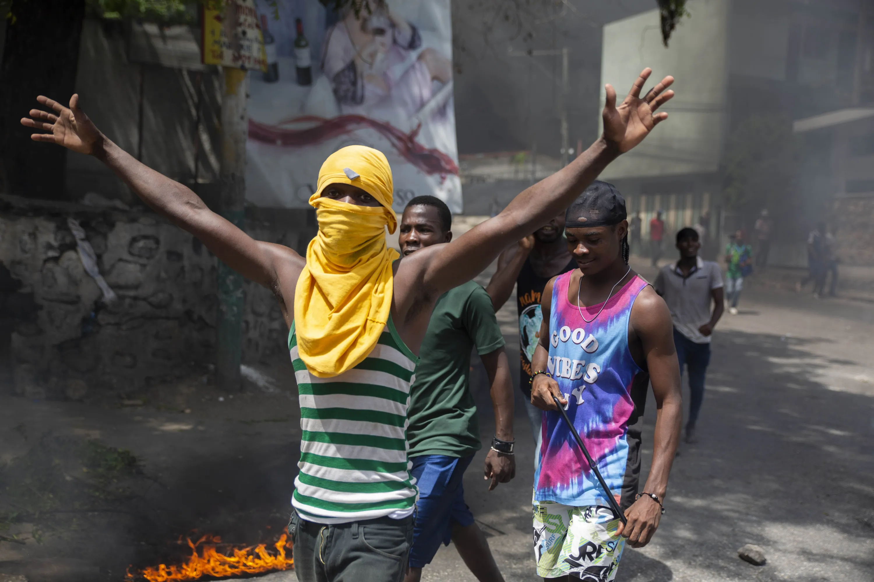 People protest against the assassination of Haitian President Jovenel Moïse near the police station of Petion Ville in Port-au-Prince, Haiti, Thursday, July 8, 2021. Officials pledged to find all those responsible for the pre-dawn raid on Moïse’s home early Wednesday in which the president was shot to death and his wife, Martine, critically wounded. (Photo by Joseph Odelyn/AP Photo)