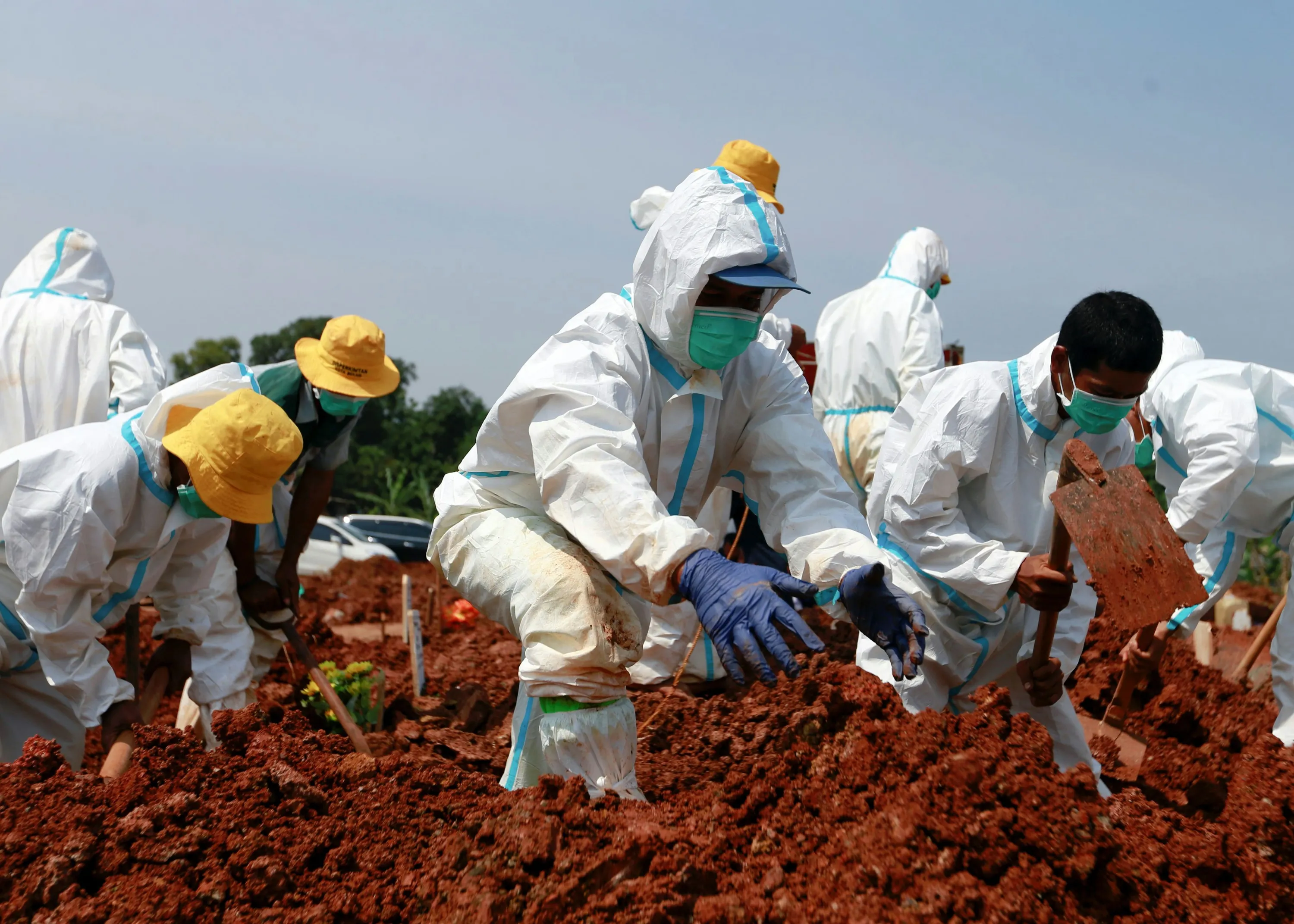 Gravediggers wearing personal protective equipment (PPE) bury a coffin at a Muslim burial area provided by the government for coronavirus disease (COVID-19) victims in Bekasi, on the outskirts of Jakarta, Indonesia, July 8, 2021. (Photo by Ajeng Dinar Ulfiana/Reuters)