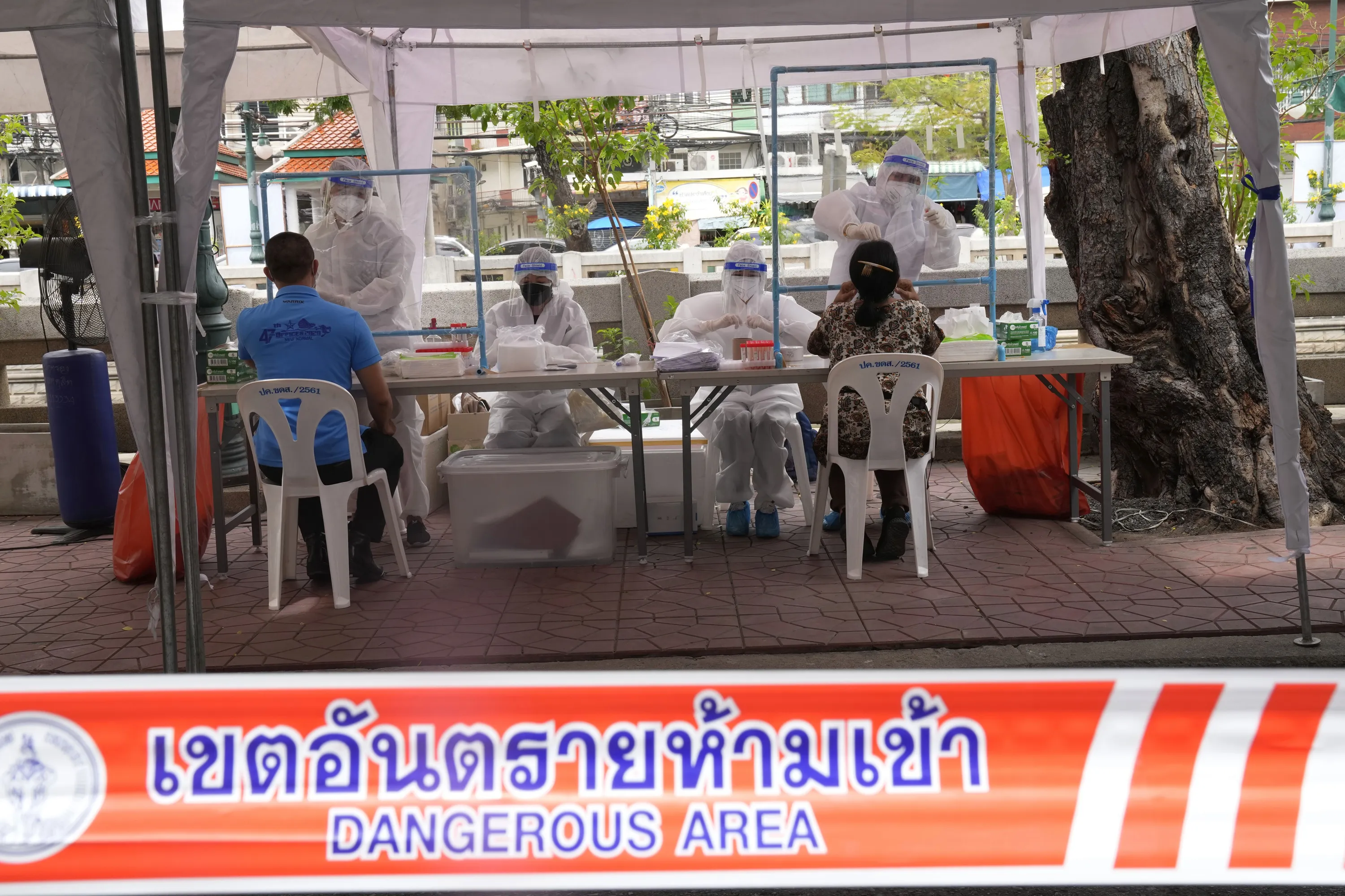 Health workers collect nasal swabs from local residents for coronavirus testing in Bangkok, Thailand, Thursday, July 8, 2021. A week into an ambitious but risky plan to open the resort island of Phuket to fully-vaccinated visitors, signs were encouraging that the gambit to help breathe new life into the struggling tourism industry was working, even as coronavirus numbers in the rest of Thailand surged Thursday to new record highs. (Photo by Sakchai Lalit/AP Photo)
