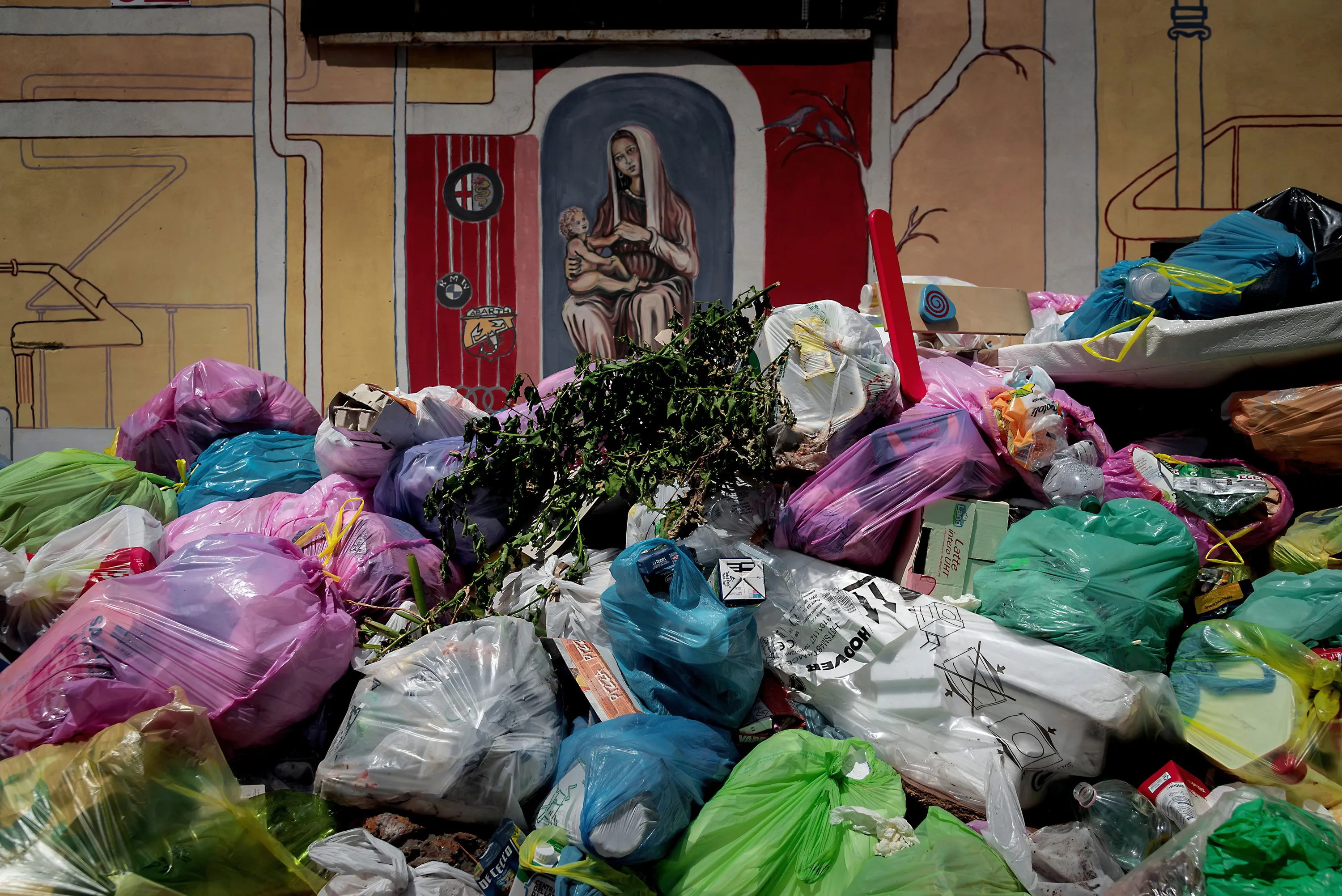 A painting of the Madonna and Infant Jesus is seen behind overflowing trash bins on the street as the city struggles with a garbage problem aggravated by the summer heat, on July 7, 2021 in Rome, Italy. (Photo by Stefano Montesi – Corbis/Corbis via Getty Images)