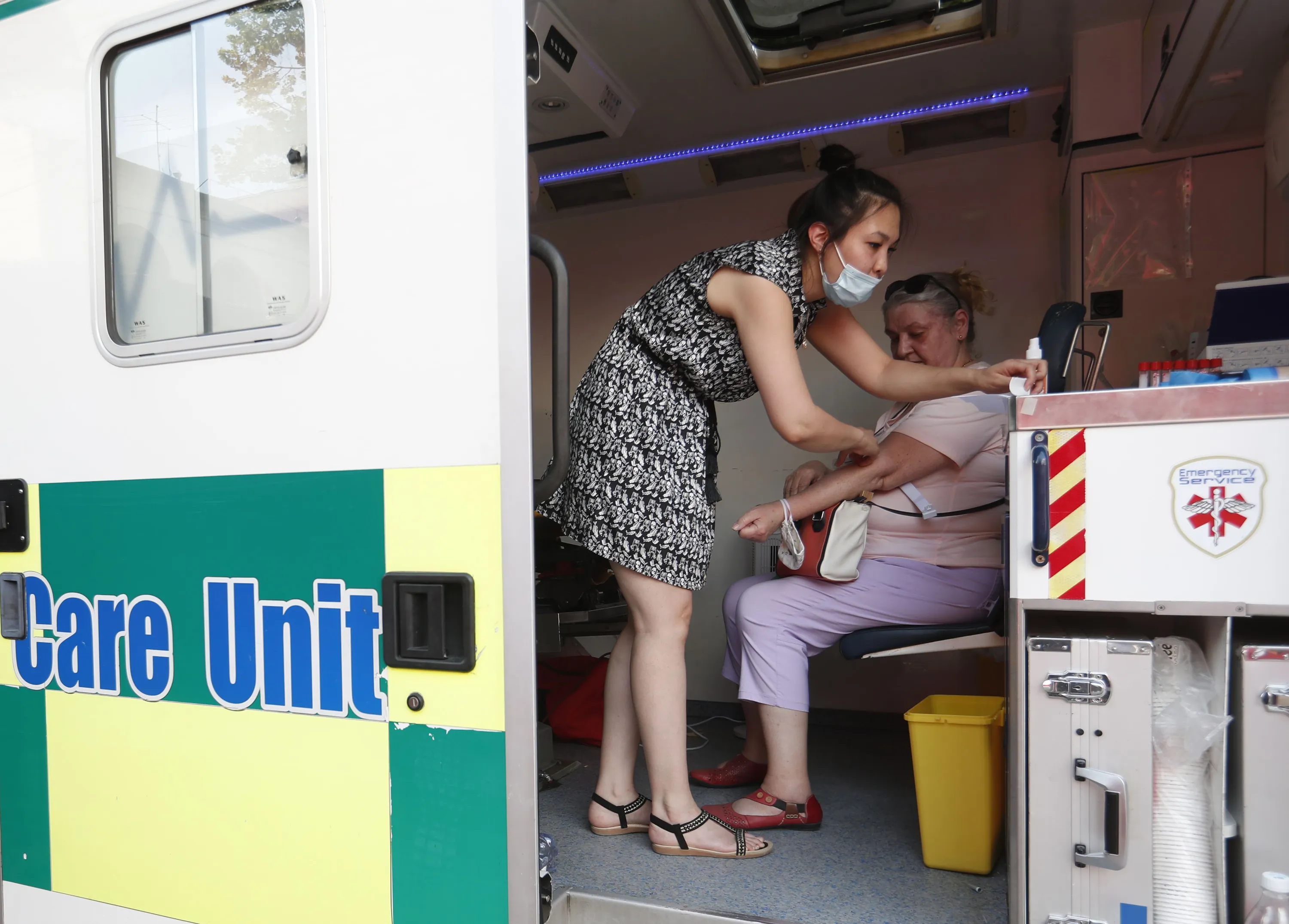 A staff member takes blood for an antibody test in Budapest, Thursday, July 8, 2021. Hungary's capital city is offering free antibody testing to its elderly residents, a bid to pressure the central government to take action over concerns that certain COVID-19 vaccines do not provide adequate protection against the virus. (Photo by Laszlo Balogh/AP Photo)