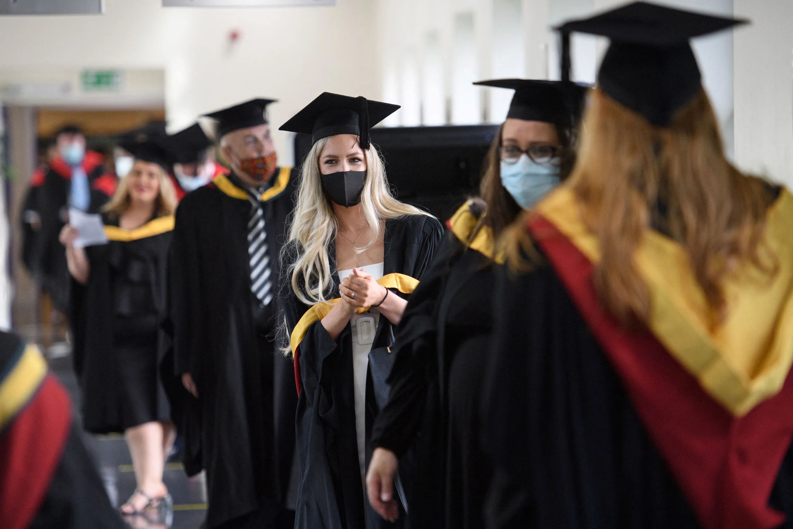 Graduates queue on campus at the University of Bolton as they wait to receive their degree certificates in a Covid-safe, in-person graduation ceremony one of a handful taking place this year due to the coronavirus lockdown restrictions in Bolton, northwest England on July 9, 2021. Over 7,000 students will take part in the graduation ceremony over the course of a week. (Photo by Oli Scarff/AFP Photo)