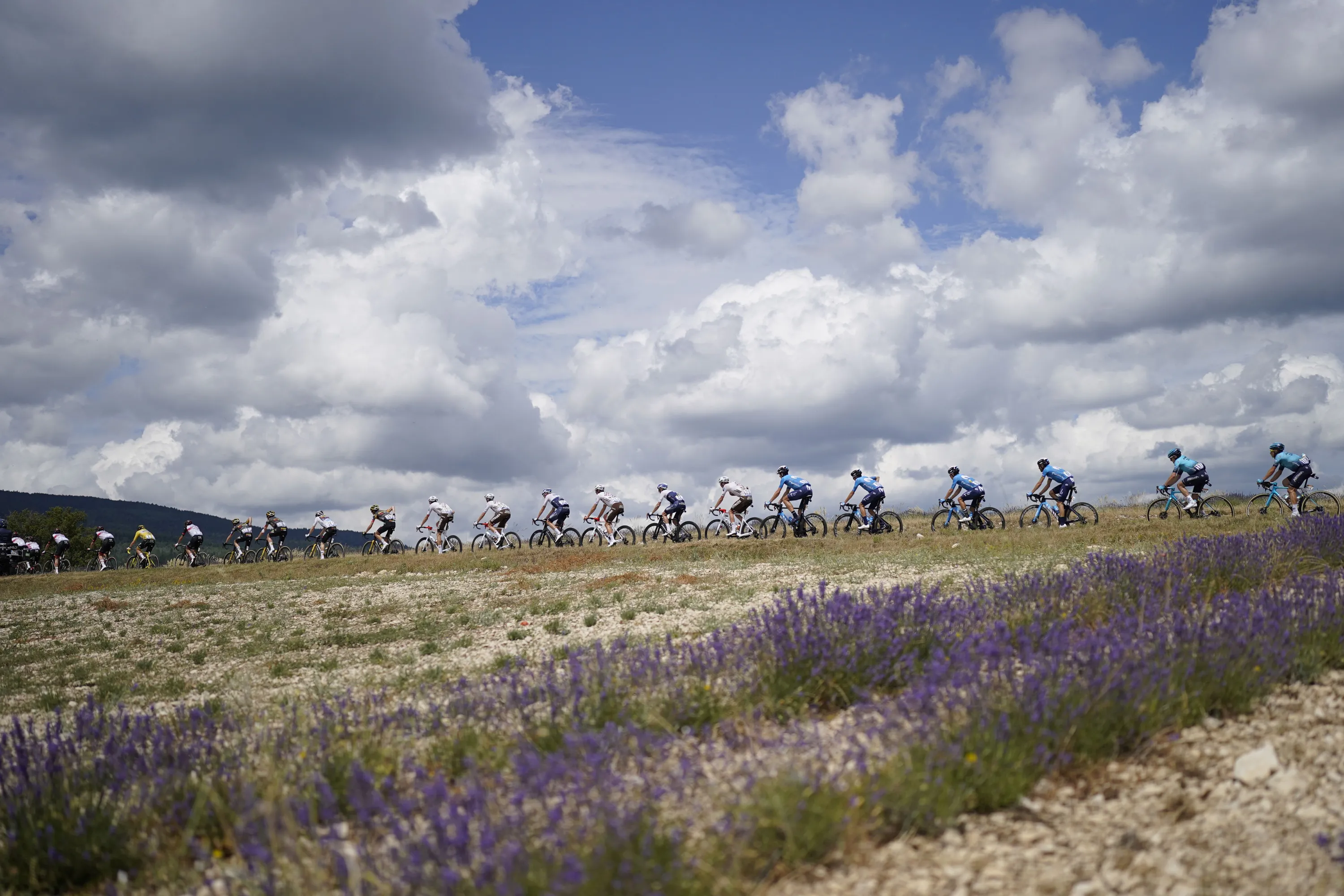 The pack rides during the eleventh stage of the Tour de France cycling race over 198.9 kilometers (123.6 miles) with start in Sorgues and finish in Malaucene, France, Wednesday, July 7, 2021. (Photo by Daniel Cole/AP Photo)