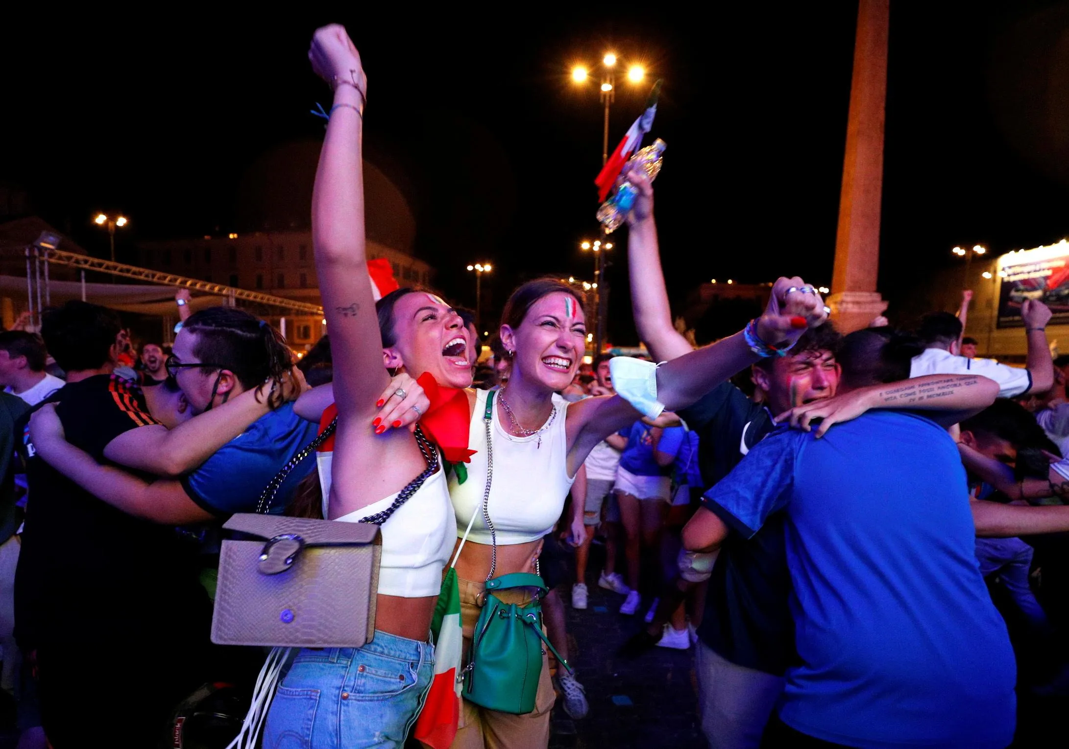 Italy fans celebrate after Federico Chiesa scores their first goal in Euro 2020 Semi-Final match between Italy and Spain, played at Wembley stadium, on July 6, 2021 in Rome, Italy. (Photo by Guglielmo Mangiapane/Reuters)