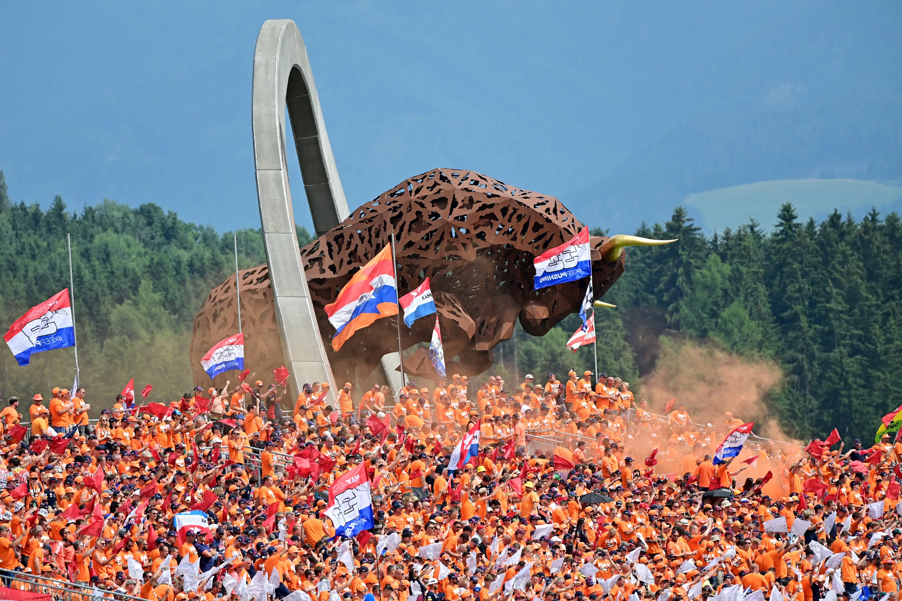 Supporters of Red Bull's Dutch driver Max Verstappen cheer from the stands near the large-scale jumping bull sculpture during the Formula One Austrian Grand Prix at the Red Bull Ring race track in Spielberg, Austria, on July 4, 2021. (Photo by Andrej Isakovic/AFP Photo)