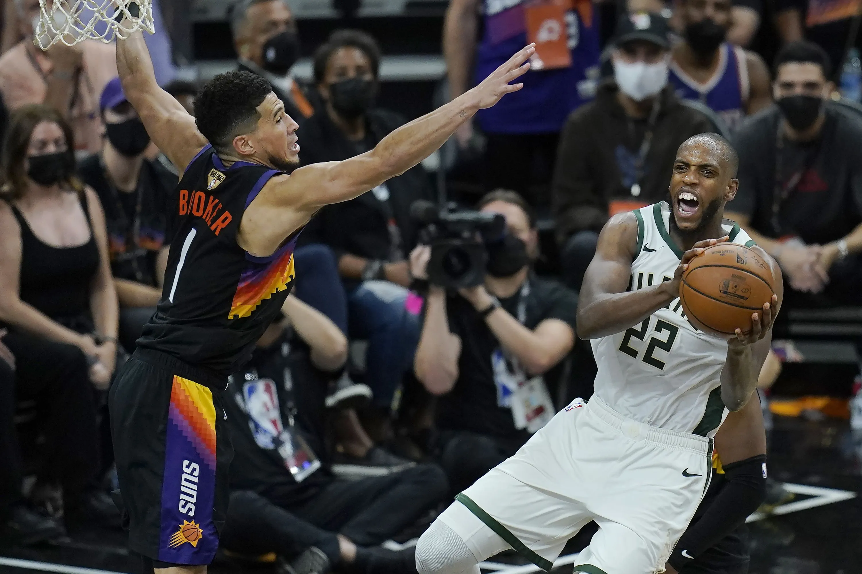 Milwaukee Bucks forward Khris Middleton (22) is defended by Phoenix Suns guard Devin Booker during the second half of Game 2 of basketball's NBA Finals, Thursday, July 8, 2021, in Phoenix. (Photo by Ross D. Franklin/AP Photo)