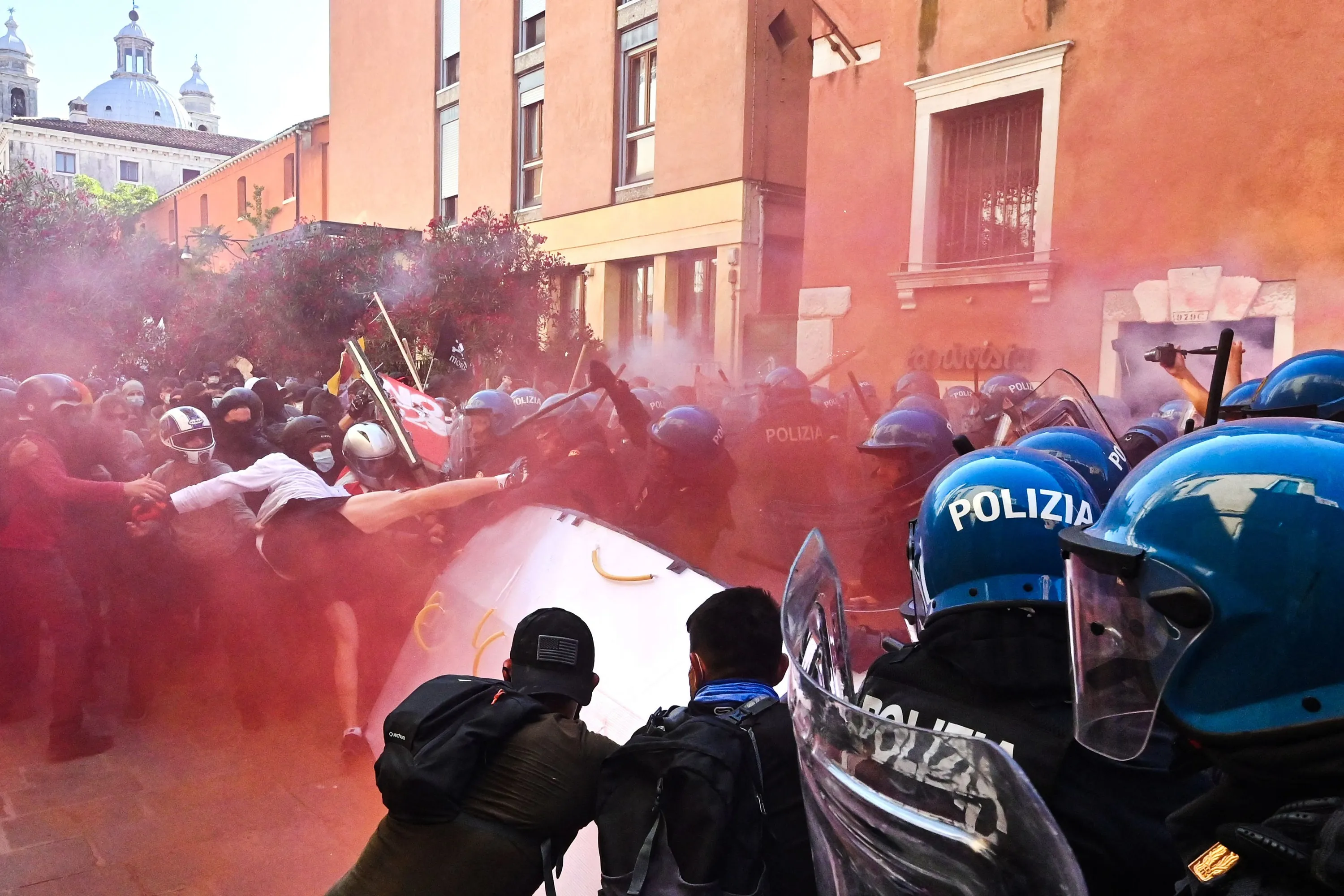 Italian policemen clash with protestors in Venice, on July 10, 2021, during a gathering called by the group “We are the tide” to protest against the G20 meeting between finance ministers and central bankers. (Photo by Andreas Solaro/AFP Photo)