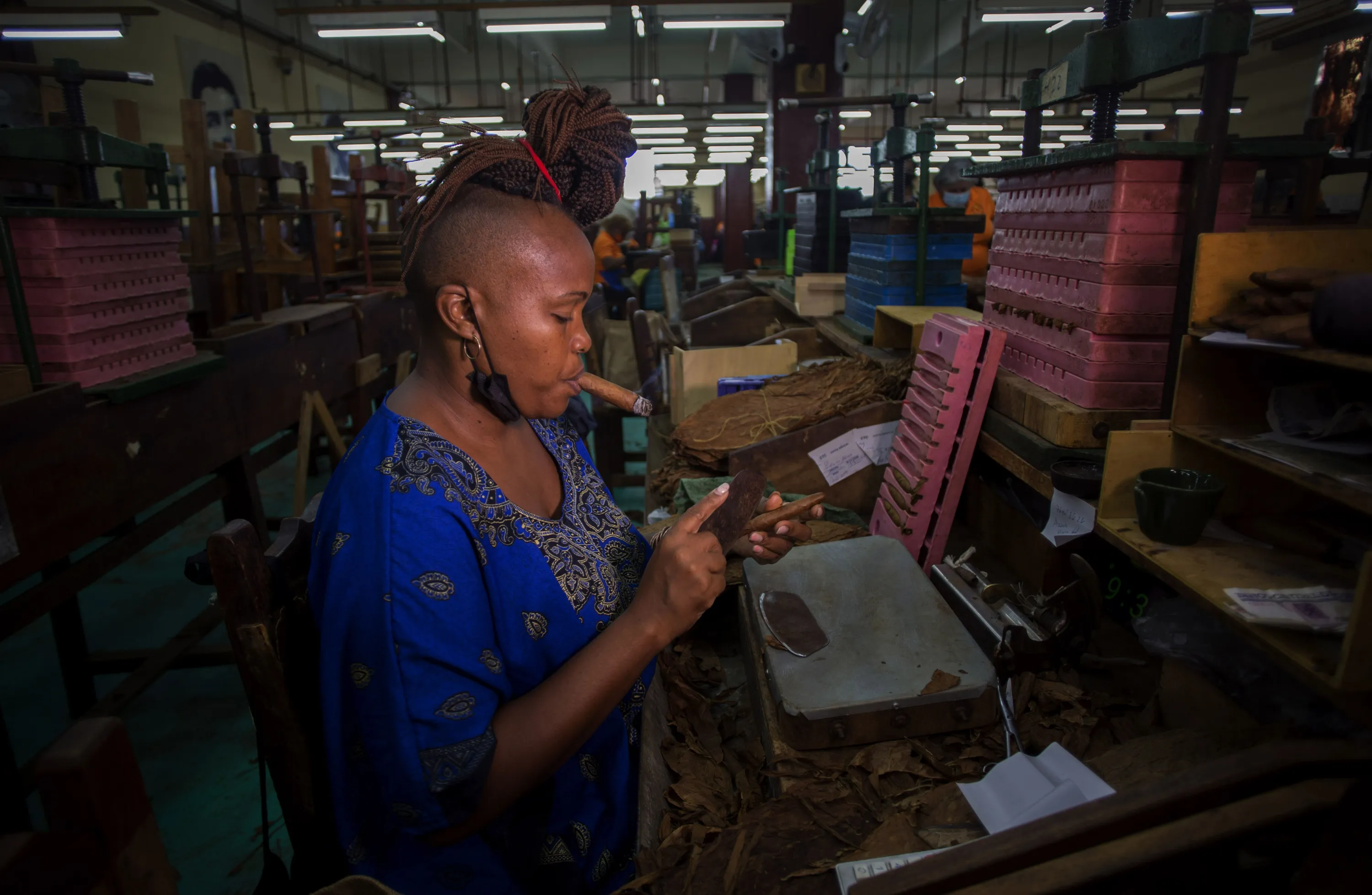 Yordanka Herrera smokes a cigar while making them at the La Corona Tobacco factory where a worker reads to workers in Havana, Cuba, Tuesday, June 29, 2021. (Photo by Ismael Francisco/AP Photo)