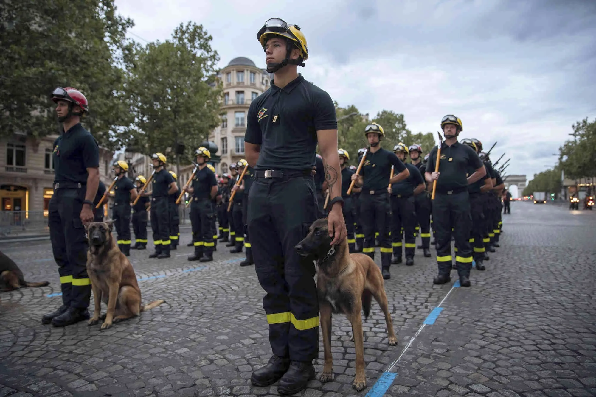 Paris firefighters and their military dogs await on the Champs Elysees avenue during a rehearsal for the Bastille Day parade in Paris Monday, July 12, 2021. Bastille Day is the French national holiday that commemorates the beginning of the French Revolution on July 14, 1789. (Photo by Lewis Joly/AP Photo)
