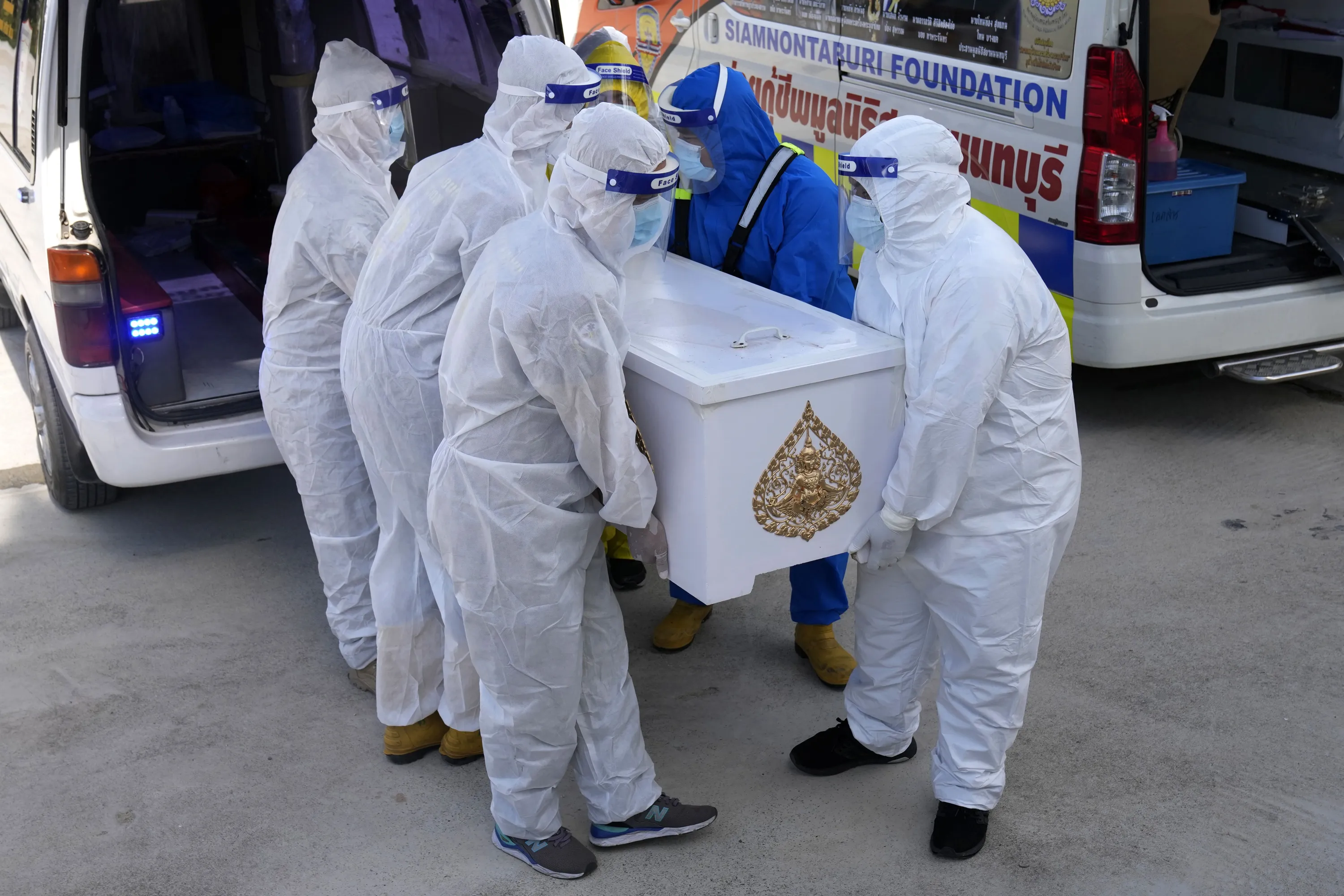 Siam Nonthaburi Foundation volunteers in full protective suits carrying coffin with a COVID-19 victim for a free funeral ceremony service at Wat Ratprakongtham temple Nonthaburi Province, Thailand, Monday, July 12, 2021. Wat Ratprakongtham temple offering free funeral service for people dying from COVID-19 says it is struggling to keep up with 24-hour cremation, and is adding another crematorium as Thailand sees a growing number of cases and deaths in a coronavirus surge that began in early April. (Photo by Sakchai Lalit/AP Photo)