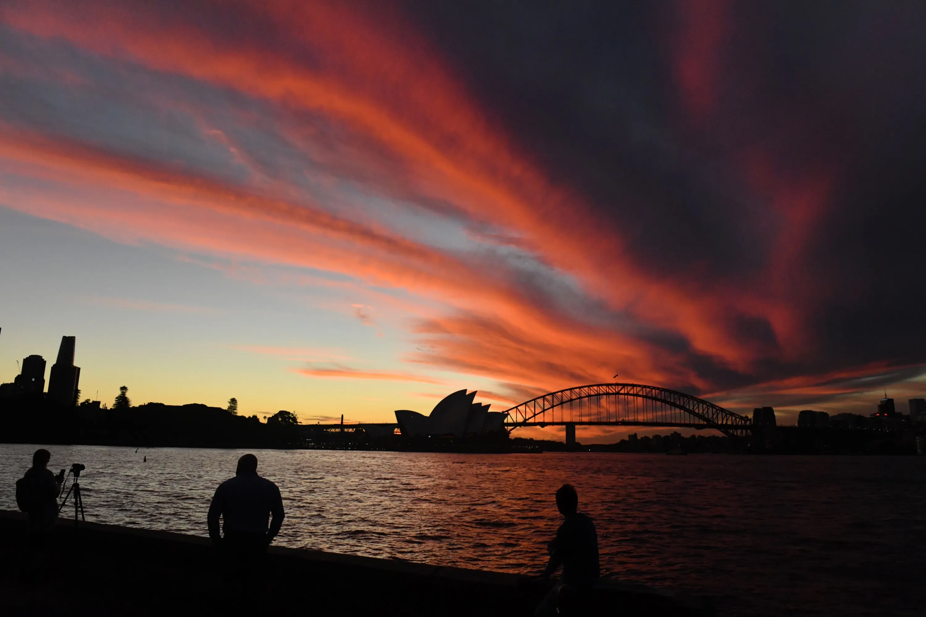 The Sydney Opera House and Sydney Harbour Bride are seen during a sunset in Sydney, Tuesday, April 20, 2021. (Photo by Mick Tsikas/AAP Image)